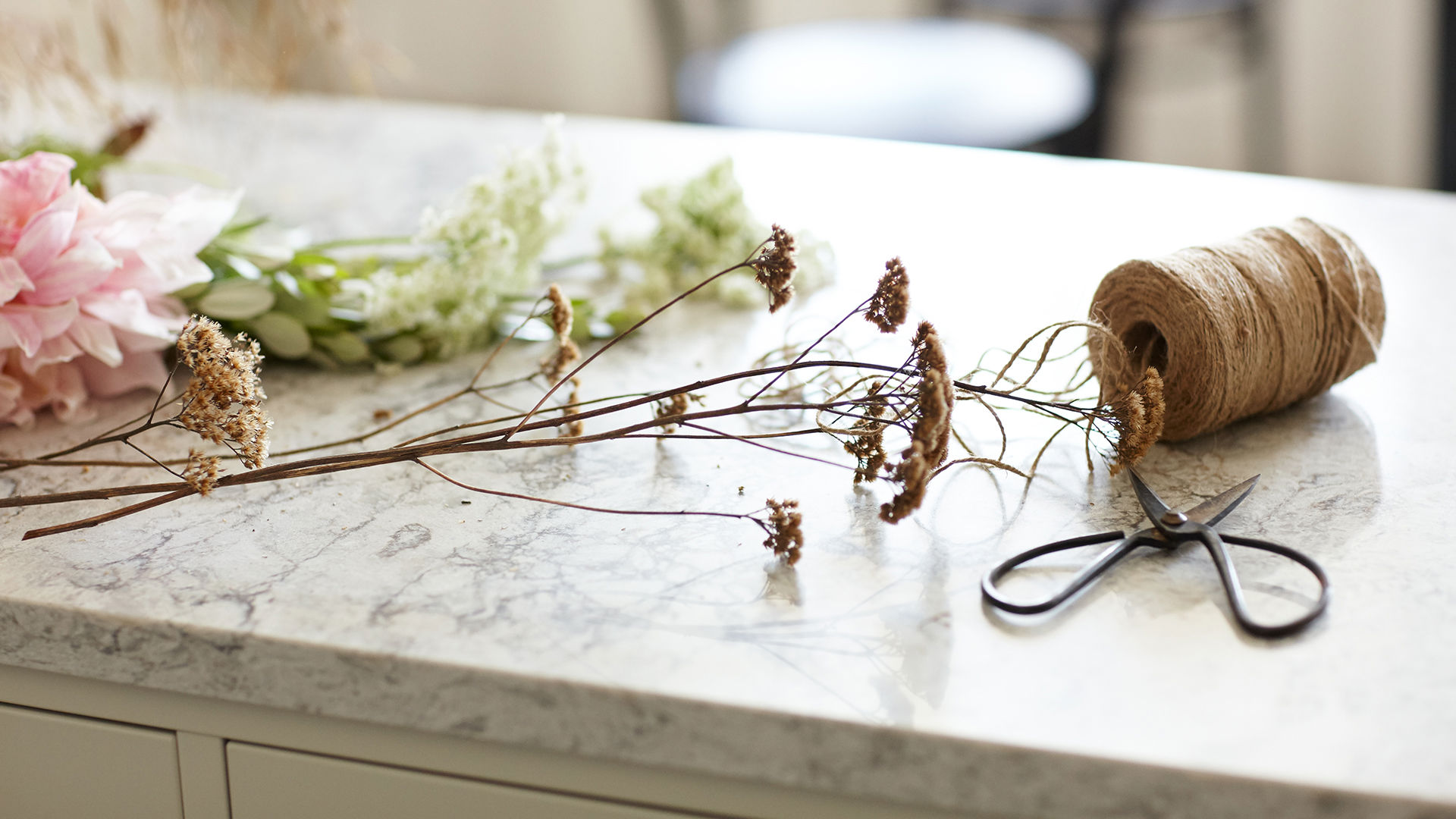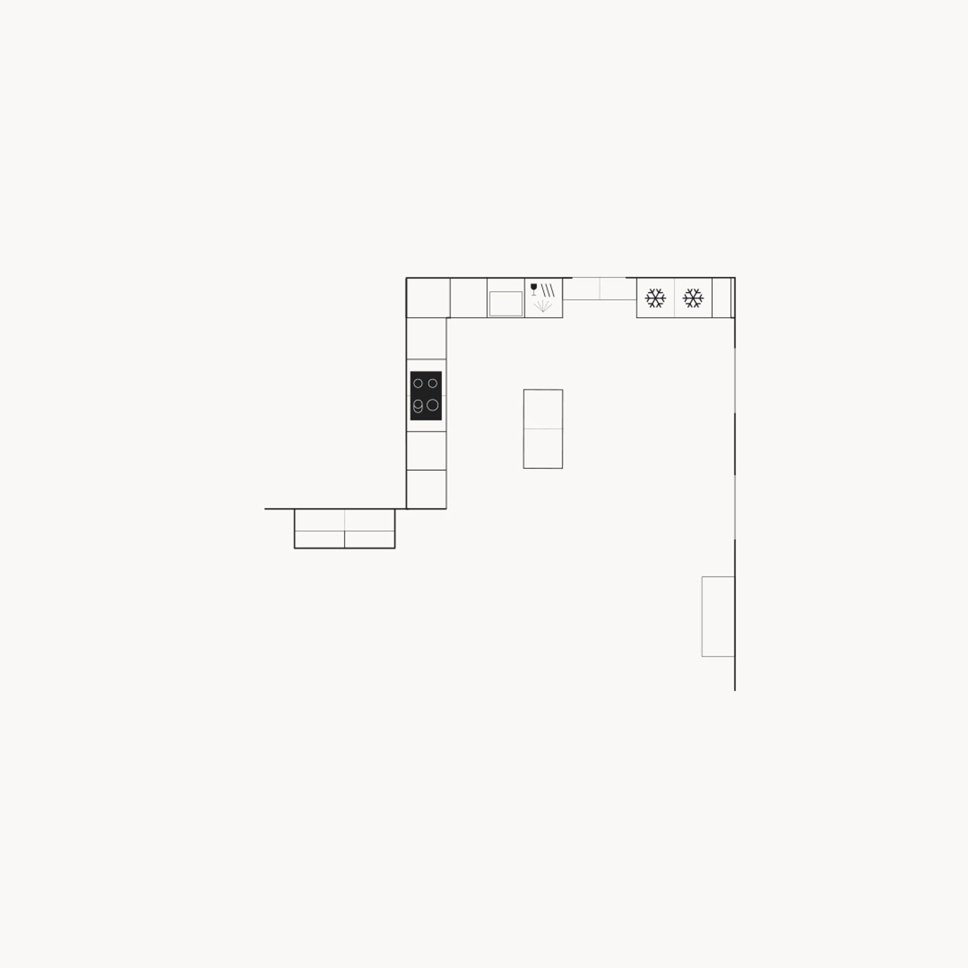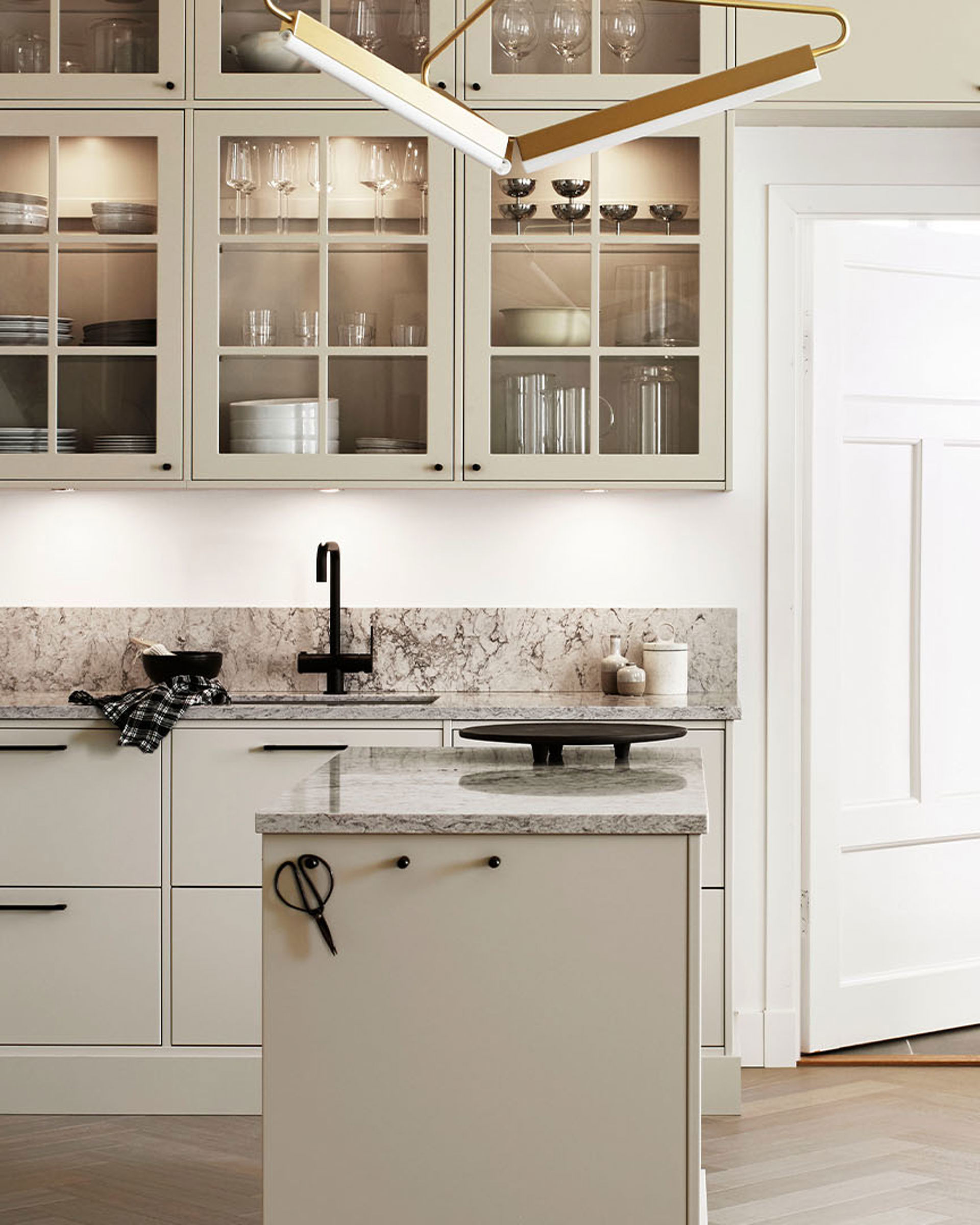 Ett stort härligt kök med luckan Moa. Kulören linnebeige ger köket ett naturligt, stilrent och samtidigt varmt uttryck. Väggskåp med luckan Alice i vitrin skapar både mycket förvaringsutrymme och en öppen känsla. Bänkskivan Moorland fog i kompositsten har beige grundtoner med virvlande vener i mörkare toner som tas upp av de svarta handtagen.