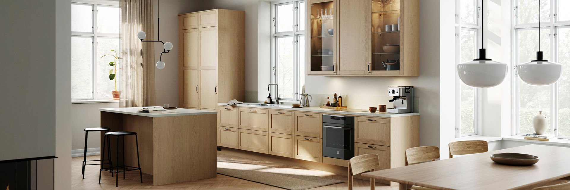 Ljus natur i ett kök med mycket träkänsla och eleganta linjer.