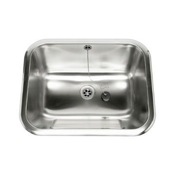 Tvättho med räfflad frontpanel, rostfritt stål för nedfällning i bänkskiva. Levereras med fästen och spännare, ventil med propp och kedja samt bräddavlopp och vattenlås.