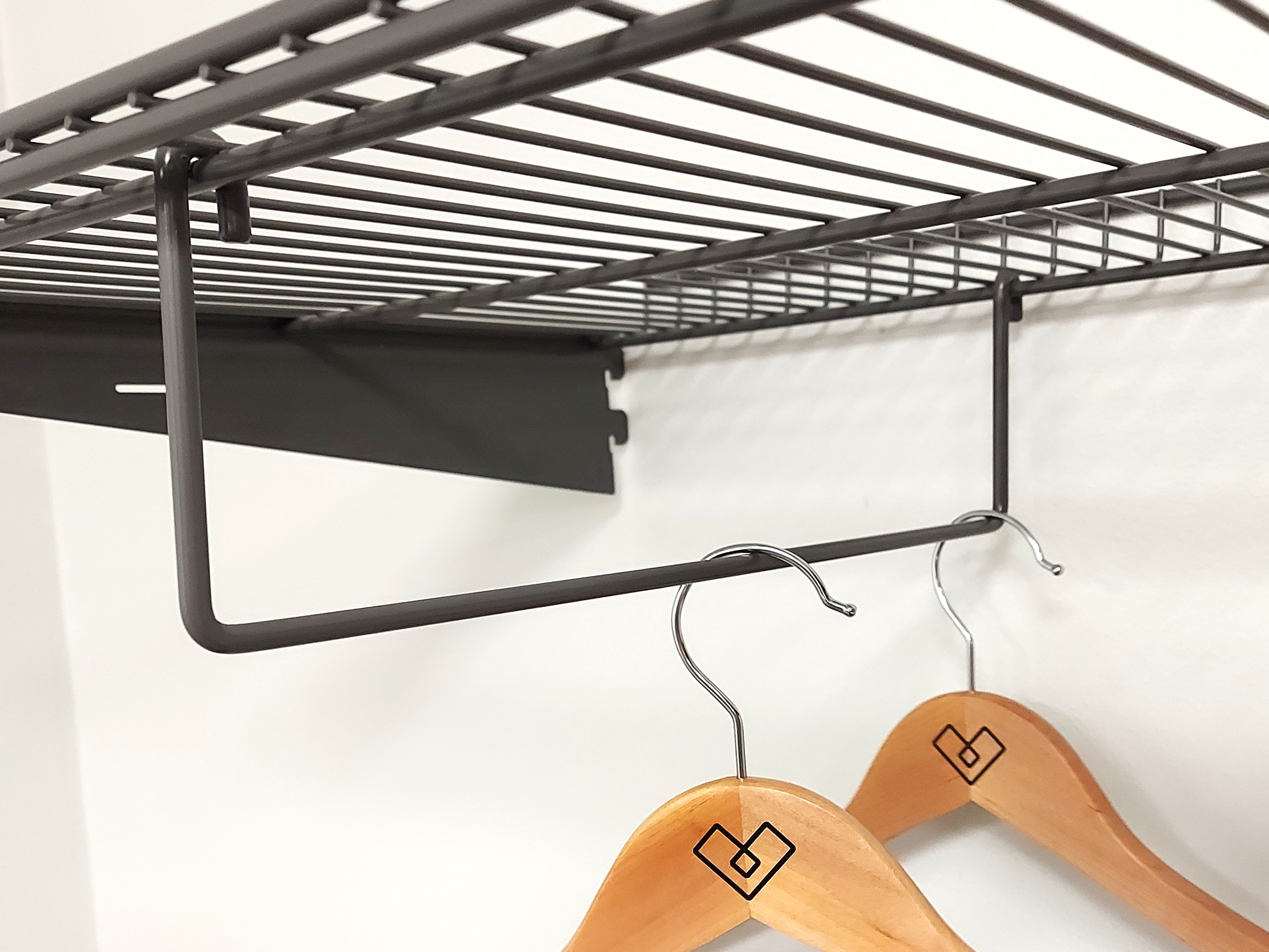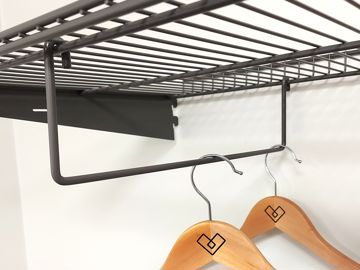 Galghållare djup 400 för placering under trådhylla Ax. Platsbesparande tvärhängning av galgarna.