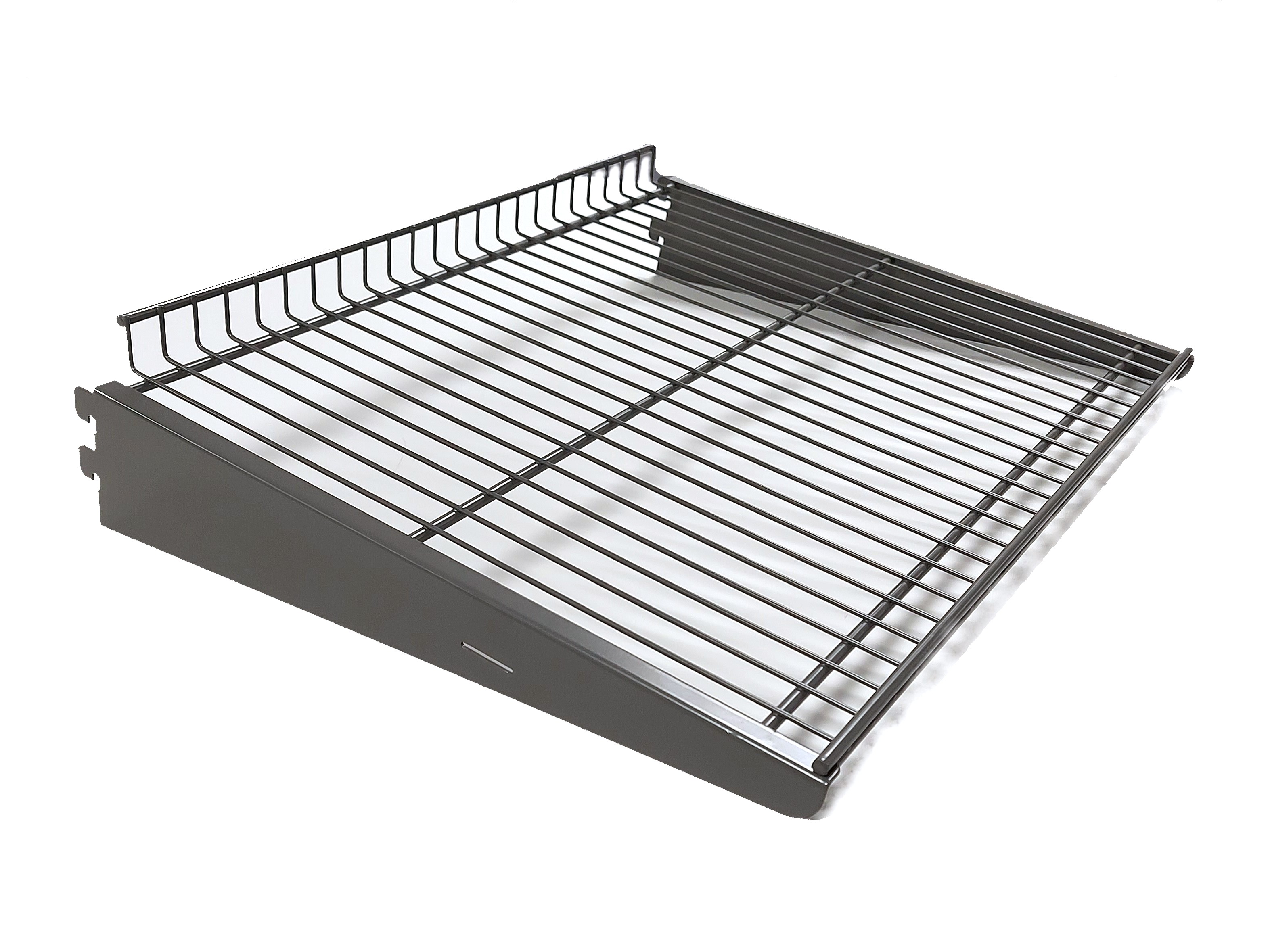 Trådhylla Ax med två fasta konsoler för placering i hängskena Ax. Finns i två bredder.