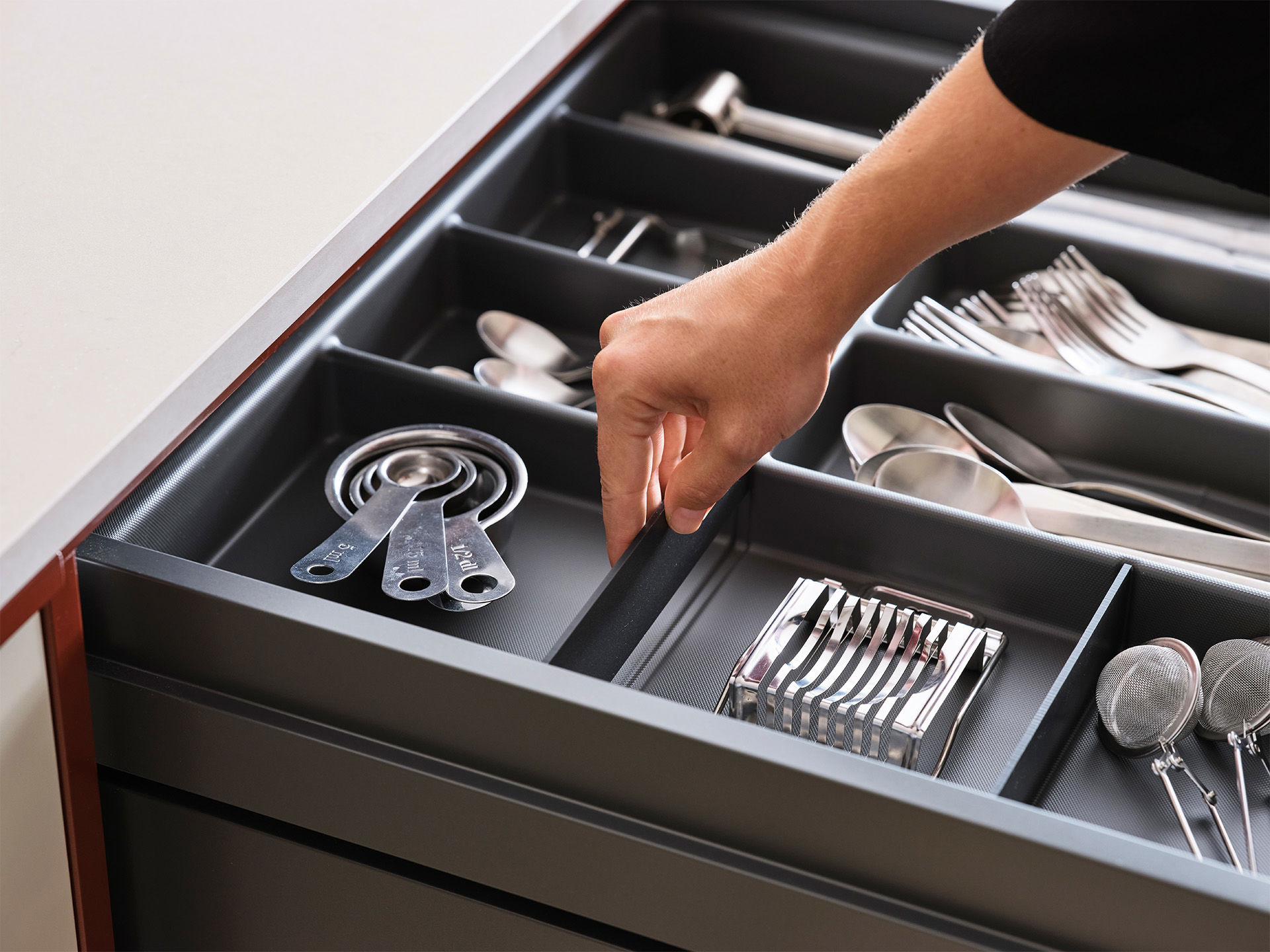Flyttbar avdelare i grå plast gör att du kan anpassa dina stora fack i besticklåda Salvia.