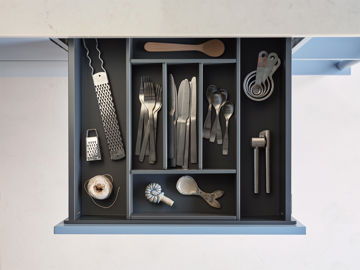 Bestickinsats för fullutdragslåda One/Scala i låddjup 500. Mörkgrå lackad plåt. Passar lådbredd 400 och uppåt. Gummimatta rekommenderas i botten på lådan.