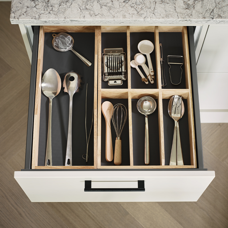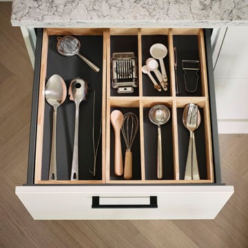 Besticklåda Sesam håller ordning på dina bestick och köksredskap, passar i lådor med djup 550 mm. Hållbart lackat Hevea trä med sinkade hörnskarvar, tjocklek 10 mm. Höjd 60 mm, bredd 303 mm och längd för låddjup 550: 528 mm. Kombinera med fler delar i Sesam träutförande eller redskapslådor Kapris i scalagrå lackad plåt, gummimatta art.nr 30763-69 rekommenderas i botten på lådan.