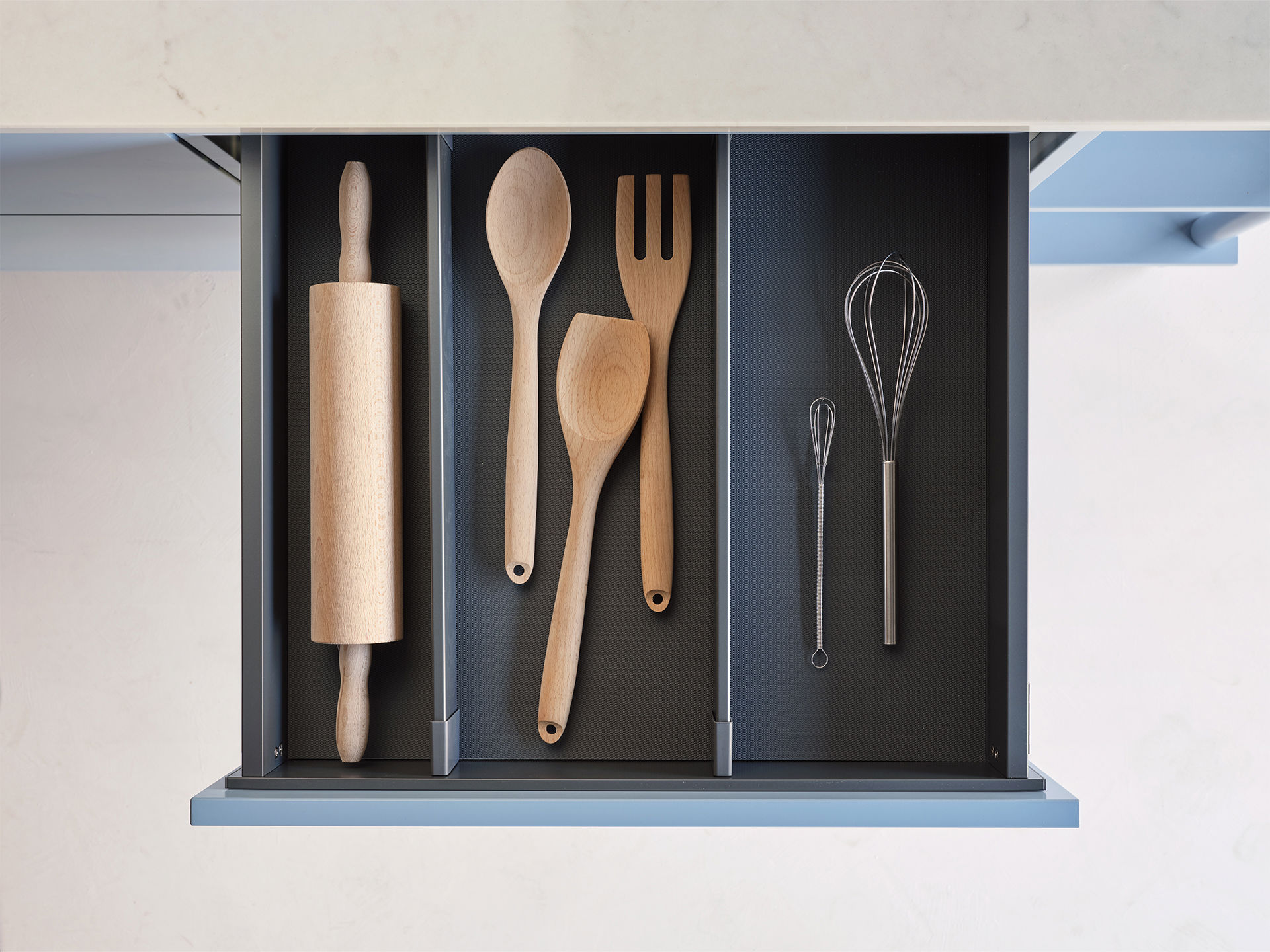 Lådavdelare som delar av lådan. I antracitgrå lackad plåt. För One med låddjup 500. Passar även de Scalalådor som finns i djup 500. Mått: Bredd 10 mm x djup 480 mm x höjd 60 mm.