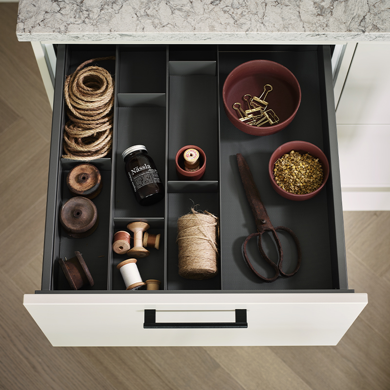 Insats Kapris är ett tillbehör till redskapslådor Kapris 30588-90. Insatsen är flyttbar och delar av redskapslådan i ett fast fack djup 257 mm och två justerbara fack. Scalagrå lackad 1,5 mm plåt, levereras komplett med gummimatta i scalagrått. Höjd 56 mm, längd 260 mm och bredd 94 mm.