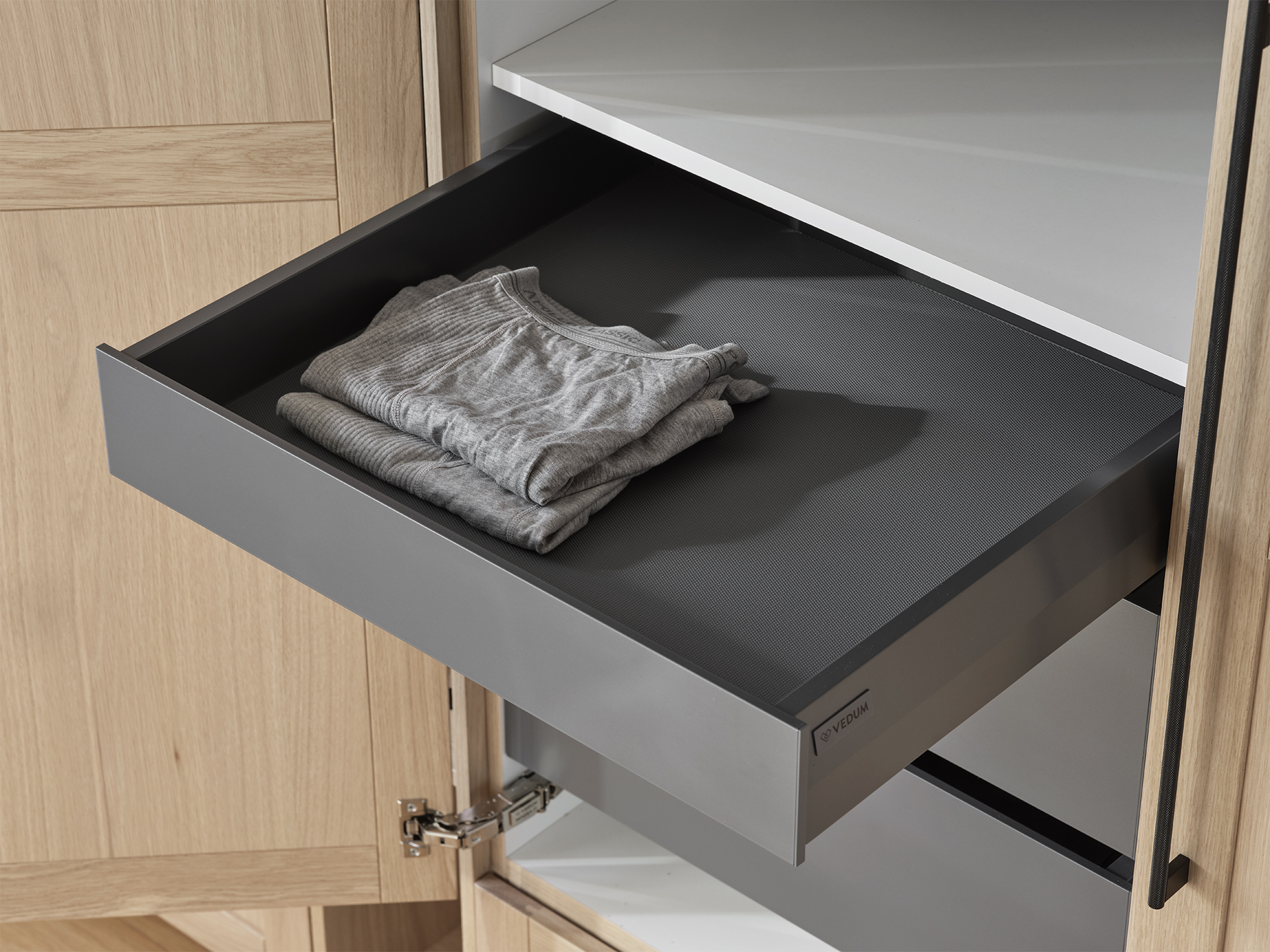 Paket med en invändig låda i höjd 90 mm med tillhörande skenor och skruv. Mer information om du kan komplettera ditt Vedumskåp med invändiga lådor hittar du i dokumentet "Garderober och bänkskåp med invändiga lådor" eller kontakta kundtjänst 0512-576 40, kundtjanst@vedum.se så hjälper vi dig.