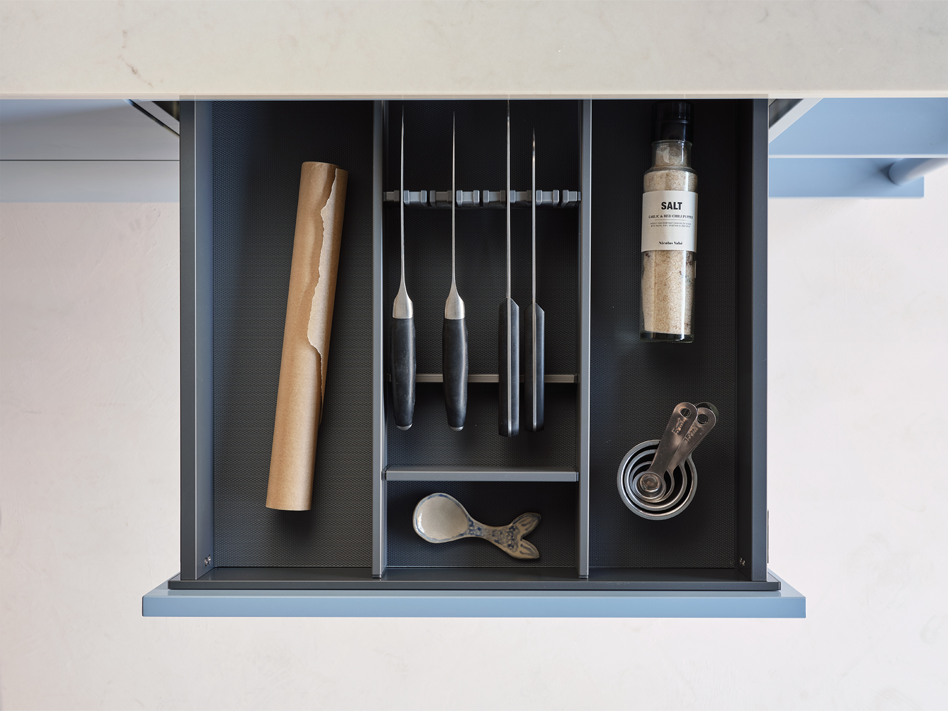 Knivinsats för fullutdragslåda One/Scala i låddjup 500. Mörkgrå lackad metall med plastspår. Passar lådbredd 300 och uppåt. Gummimatta rekommenderas i botten på lådan.