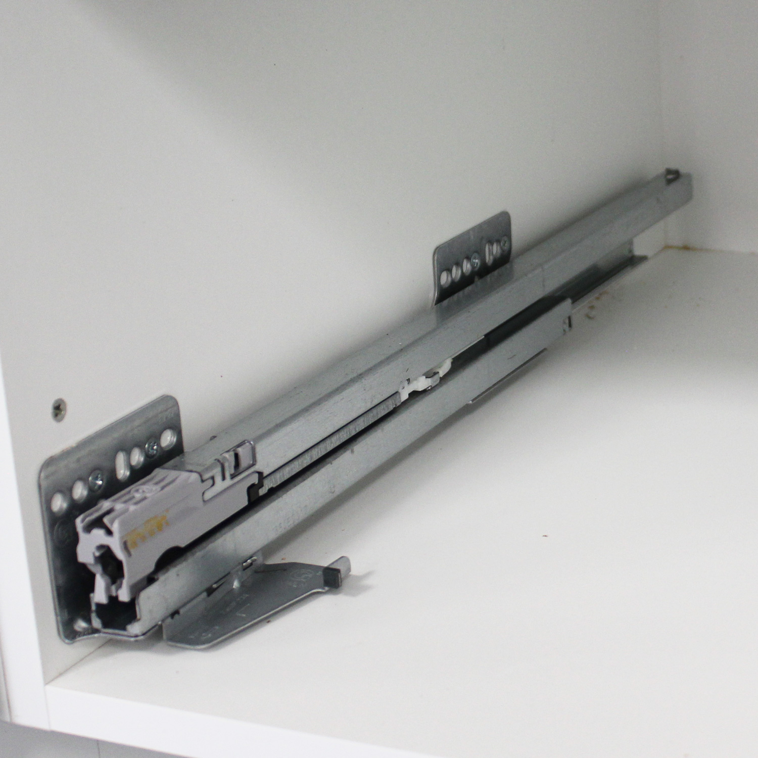 Fullutdragsskena med dämpning djup 350, vänster. Passar One lådor i djup 350. Två skenor (höger och vänster) skruvas i skåpstommen med systemskruv.