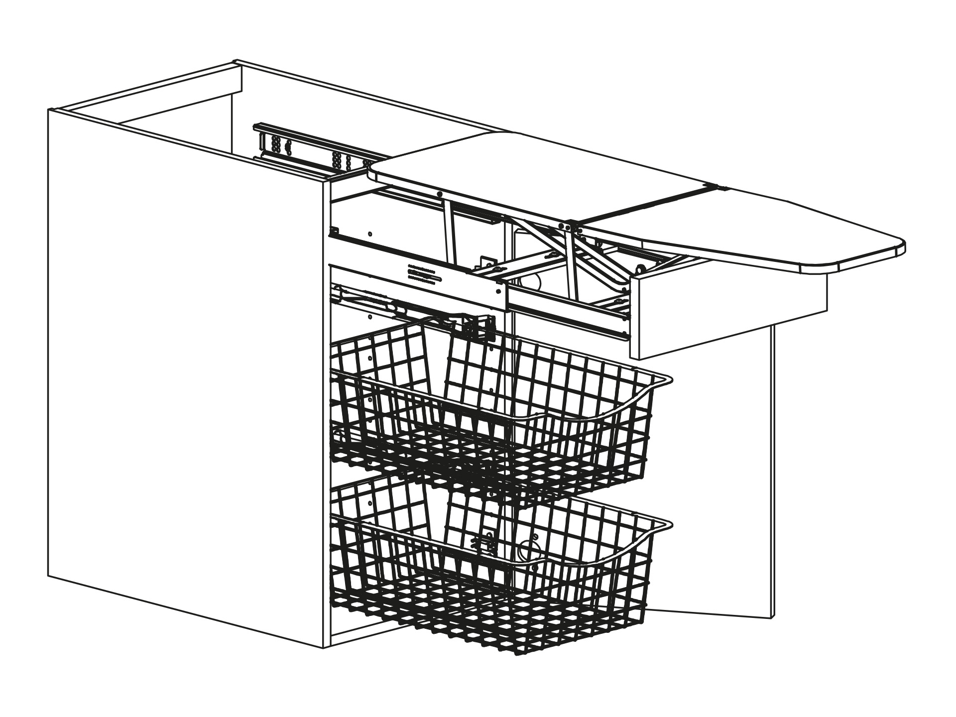 Bänkskåp med lucka strykbräda och två trådbackar, höjd 720 djup 580