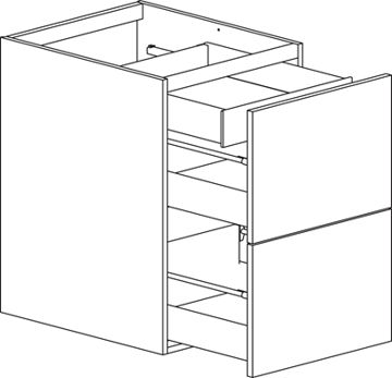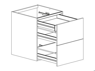 Bänkskåp med två fullutdragslådor DUO och en invändig låda överst, välj Classic låddjup 500 mm- eller Scalalådor djup 550 mm. Välj front och utförande. Skärbräda kan väljas till i vissa skåpsbredder. Gummimattor ingår i båda lådorna. Skåpet finns i flera bredder. Källsortering Djurö finns som tillbehör till skåpsbredder 400, 600 och 800 mm. Som tillbehör finns 30994 Öppningshake för invändig låda (ej i kombination med PUSH).