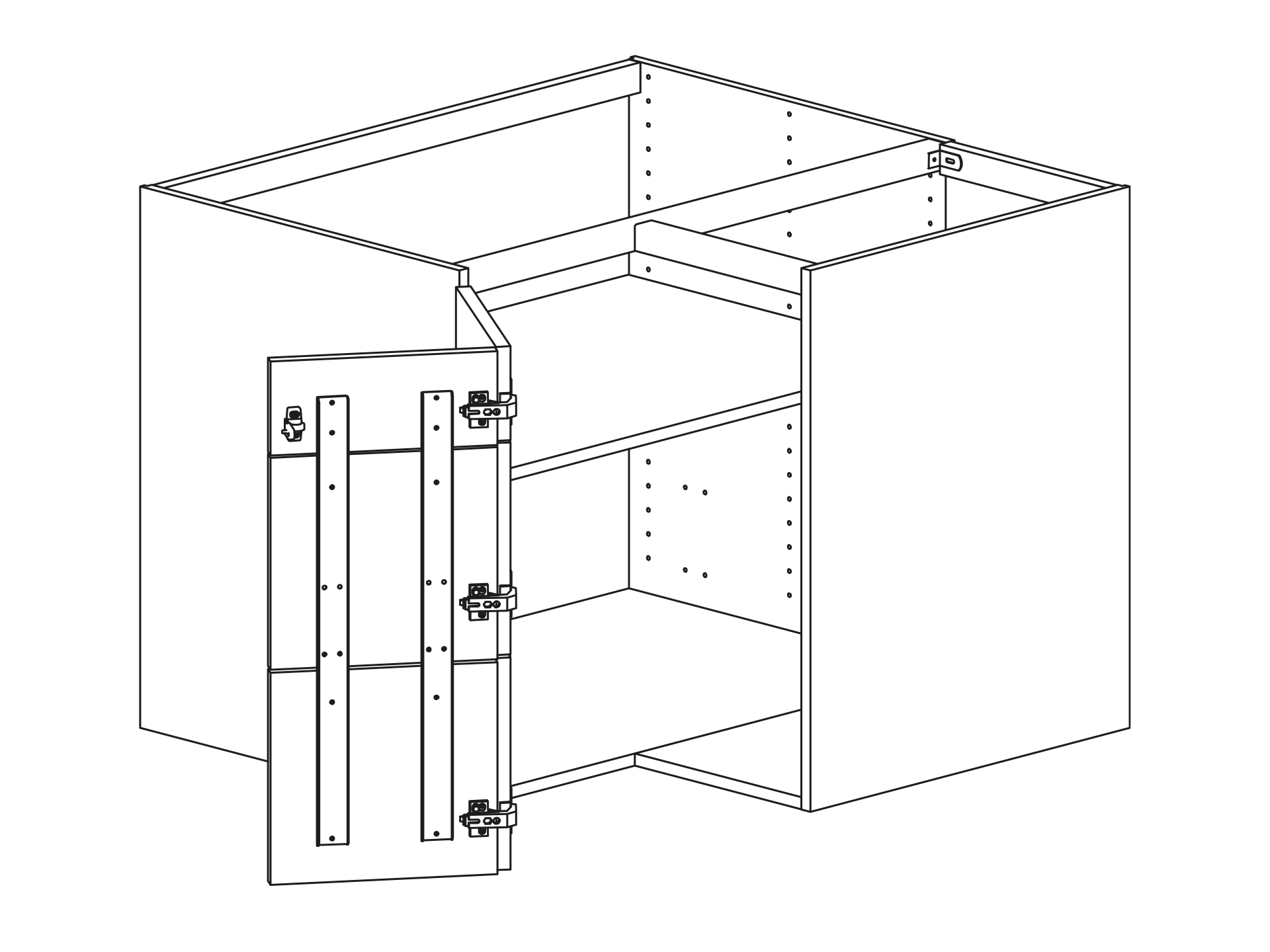 Hörnbänkskåp med en hylla, tredelad lucka 900x900mm