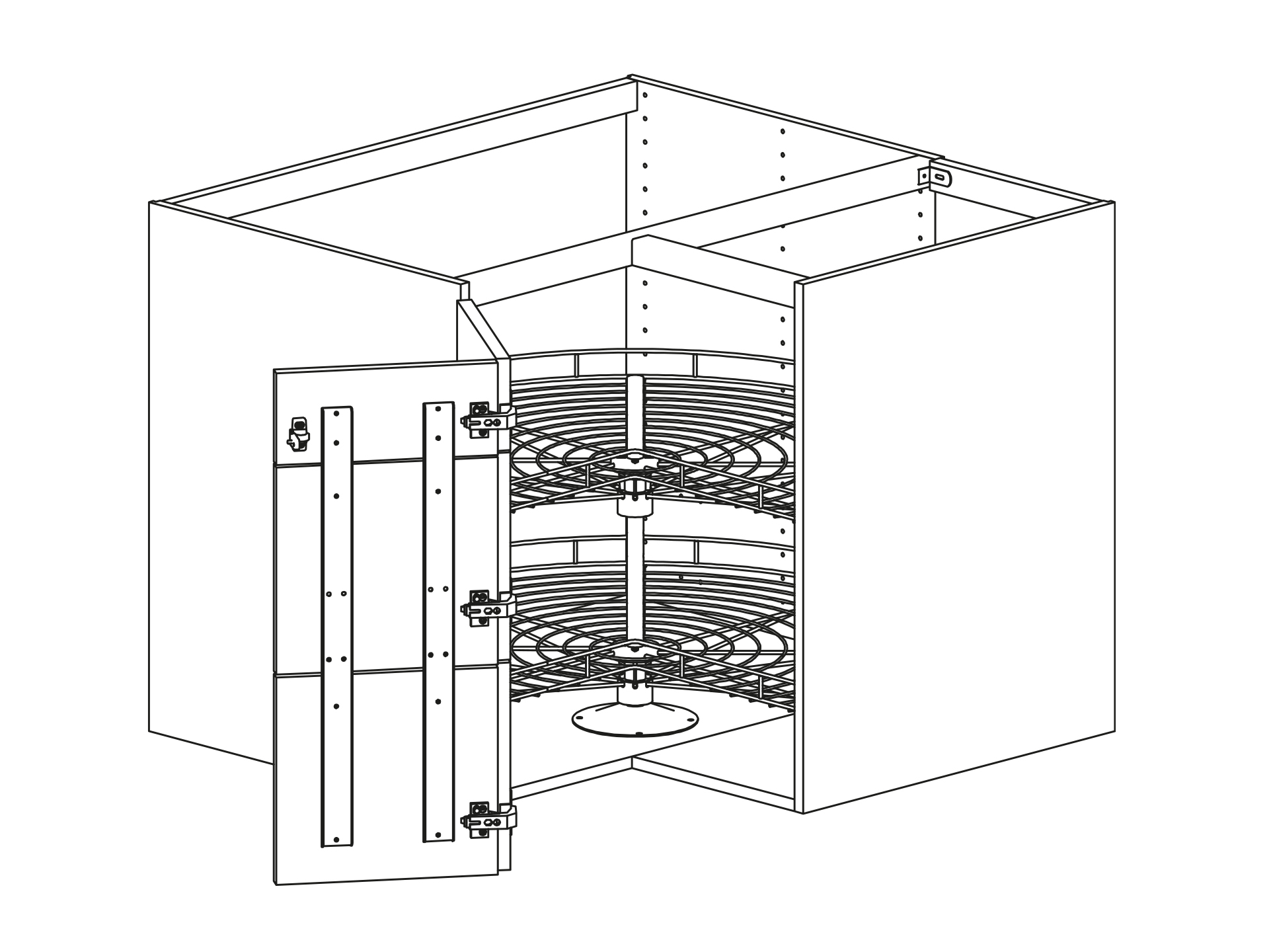 Bänkskåp för hörn i L-vinkel, 3-delad viklucka och två karuselltrådhyllor Isop. Välj front och utförande, (luckor med grepplist kan ej användas).