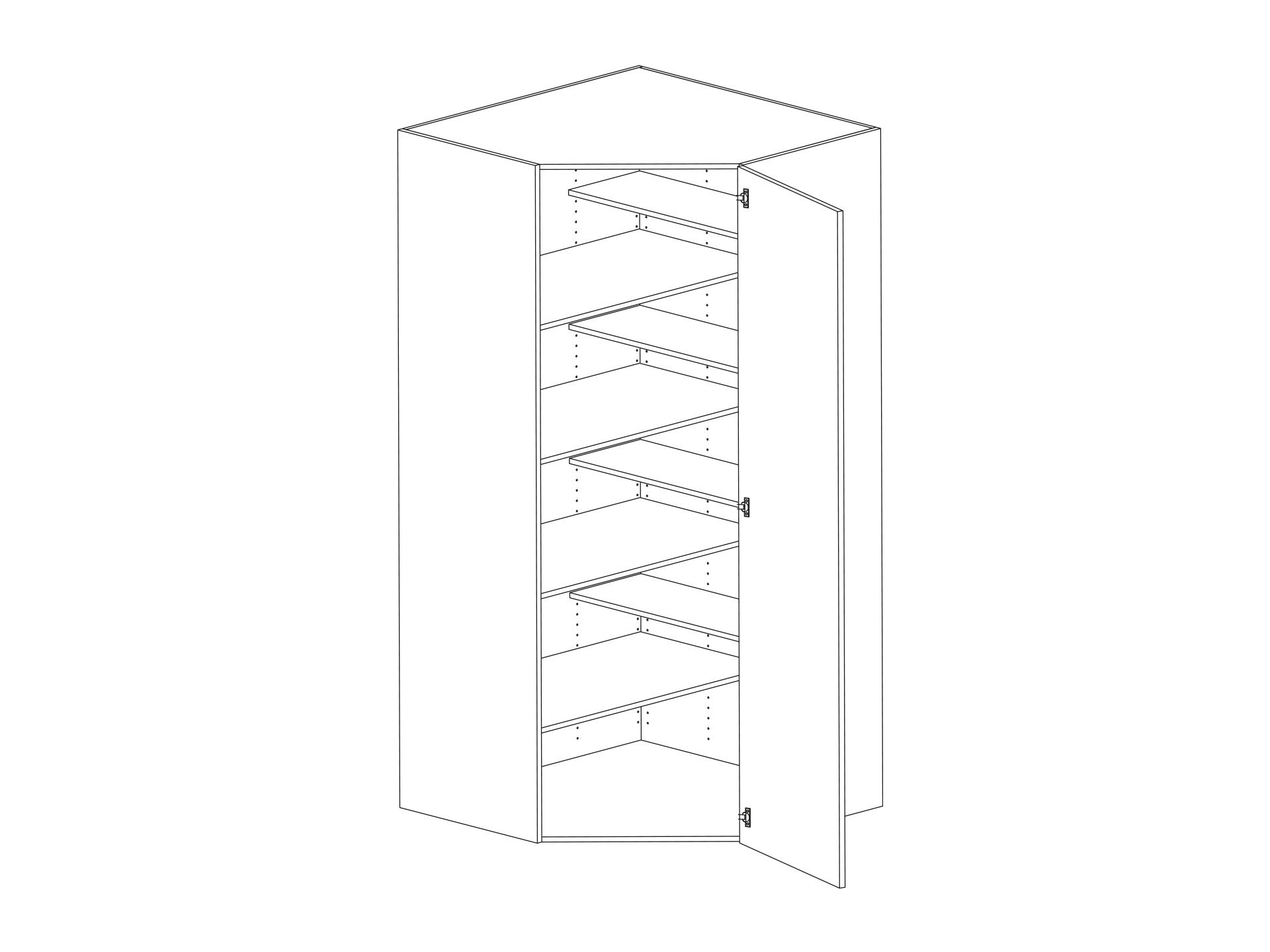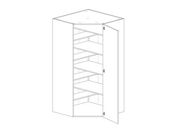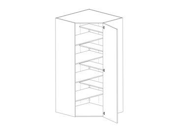 Hörnskafferi för hörn diagonalt med lucka och åtta raka hyllor, välj höger- eller vänsterhängd lucka. Välj front och utförande. Levereras i lösa delar.