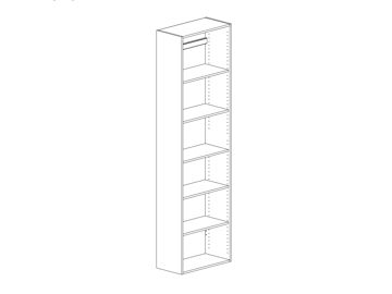 Öppen hylla utan lucka med fem flyttbara hyllor. Välj utförande i vitt eller kulör. OBS hyllplanen ligger lösa på hyllbärare stift art.nr 39001. Använd hyllbärare svart gummi art.nr 39039 om hyllplanen behöver ligga något stadigare.