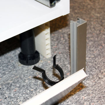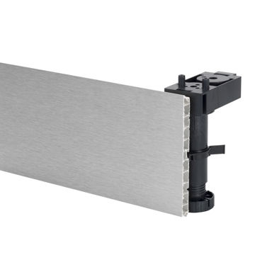 Plastsockel i rostfri look med inbyggd tätningslist nedtill. Kombineras med skarvlister i samma utförande och speciella sockelclips som monteras i sockeln och kläms fast på stödbenet. Sockellåda finns ej till denna sockel.