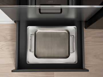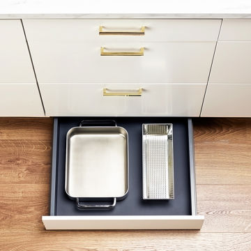 Sockellåda med fullutdragslåda One med låddjup 500 mm. Kan fås med antracitgrå låda Scala (mot pristillägg) i låddjup 500 mm. Smart förvaring för till exempel leksaker, tidskrifter eller köksredskap. Handtagslös och justerbar med push öppning som standard. Skall ej användas ihop med inramningssystemet, under diskbänkskåp eller till skåp som kräver ventilation i sockeln. Sockellådornas front tillverkas av samma material som sockeln och är obehandlad på insidan. Finns ej i rostfri look.