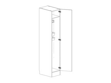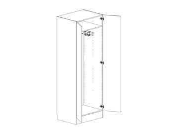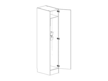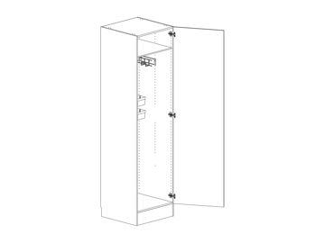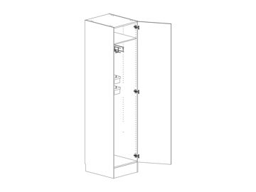Städskåp med lucka, en hylla och lös städskåpsinredning som innehåller två backar med skenor, medicinskåp och dammsugarslanghållare. Flyttbar (fast sockel). Välj höger- eller vänsterhängd lucka (bredd 800 mm har parluckor). Välj front och utförande.