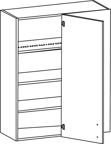Väggskåp för hörn, rak hörnmodell med lucka och tre hyllor, skärmen följer luckvalet. Välj höger- eller vänsterhängd lucka. Välj front och utförande.