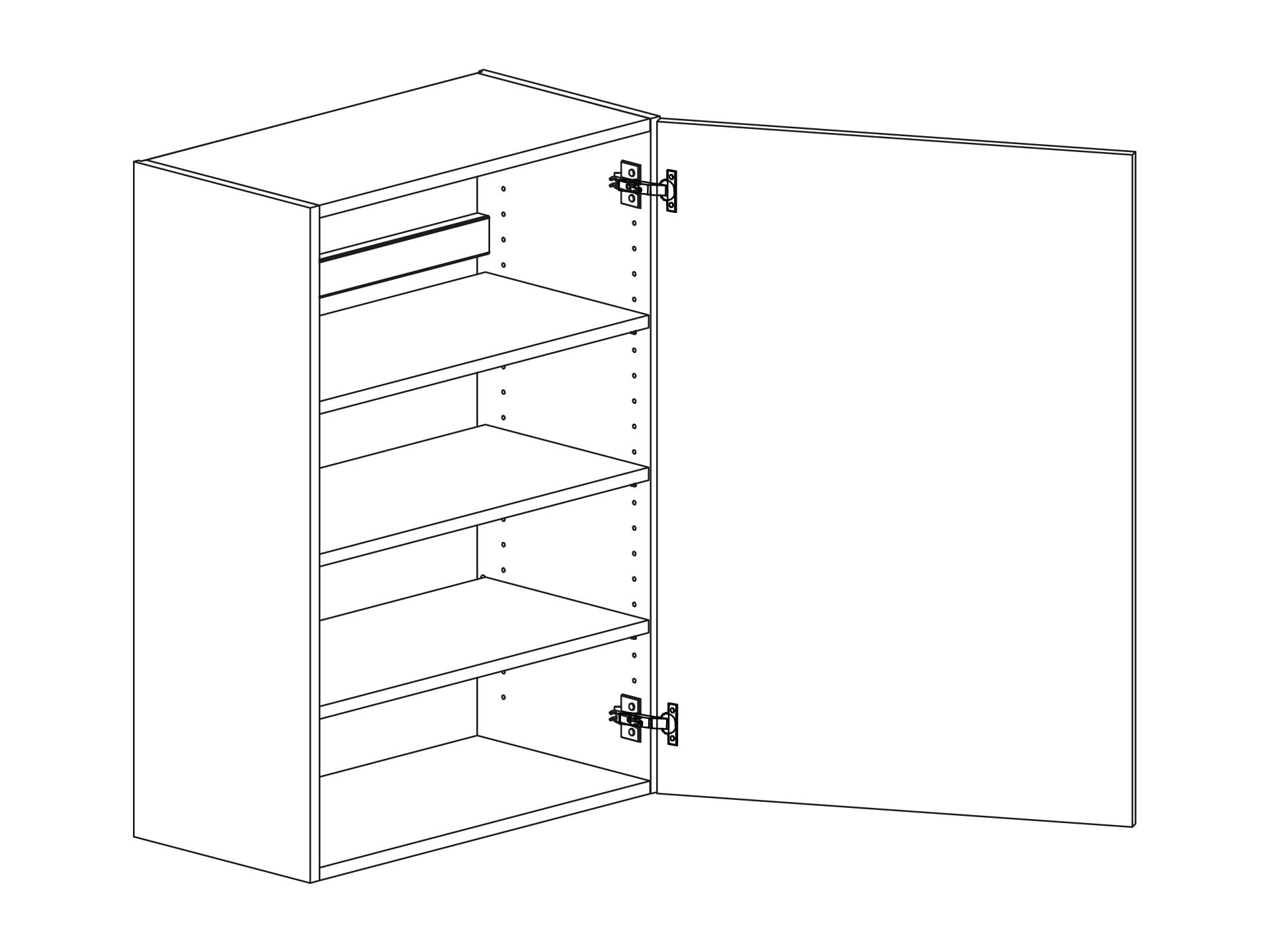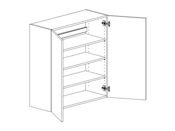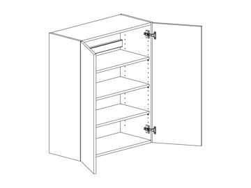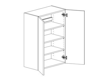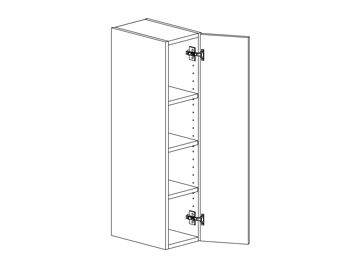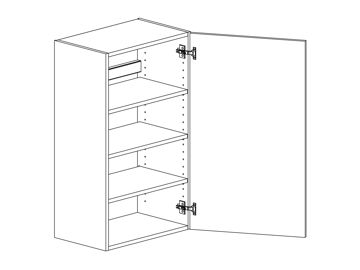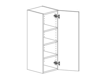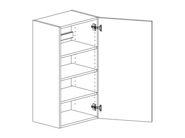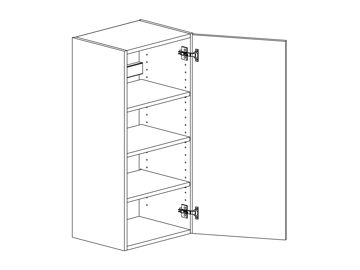 Väggskåp med lucka och tre hyllor. Välj höger- eller vänsterhängd lucka (bredd 800 mm har parluckor). Välj front och utförande. Finns även för placering på golv som grunda bänkskåp med handtagsplacering som bänkskåp, (se art.nr som slutar på B) OBS väggskåp kräver passbit eller list för att få samma bänkhöjd som ett bänkskåp.