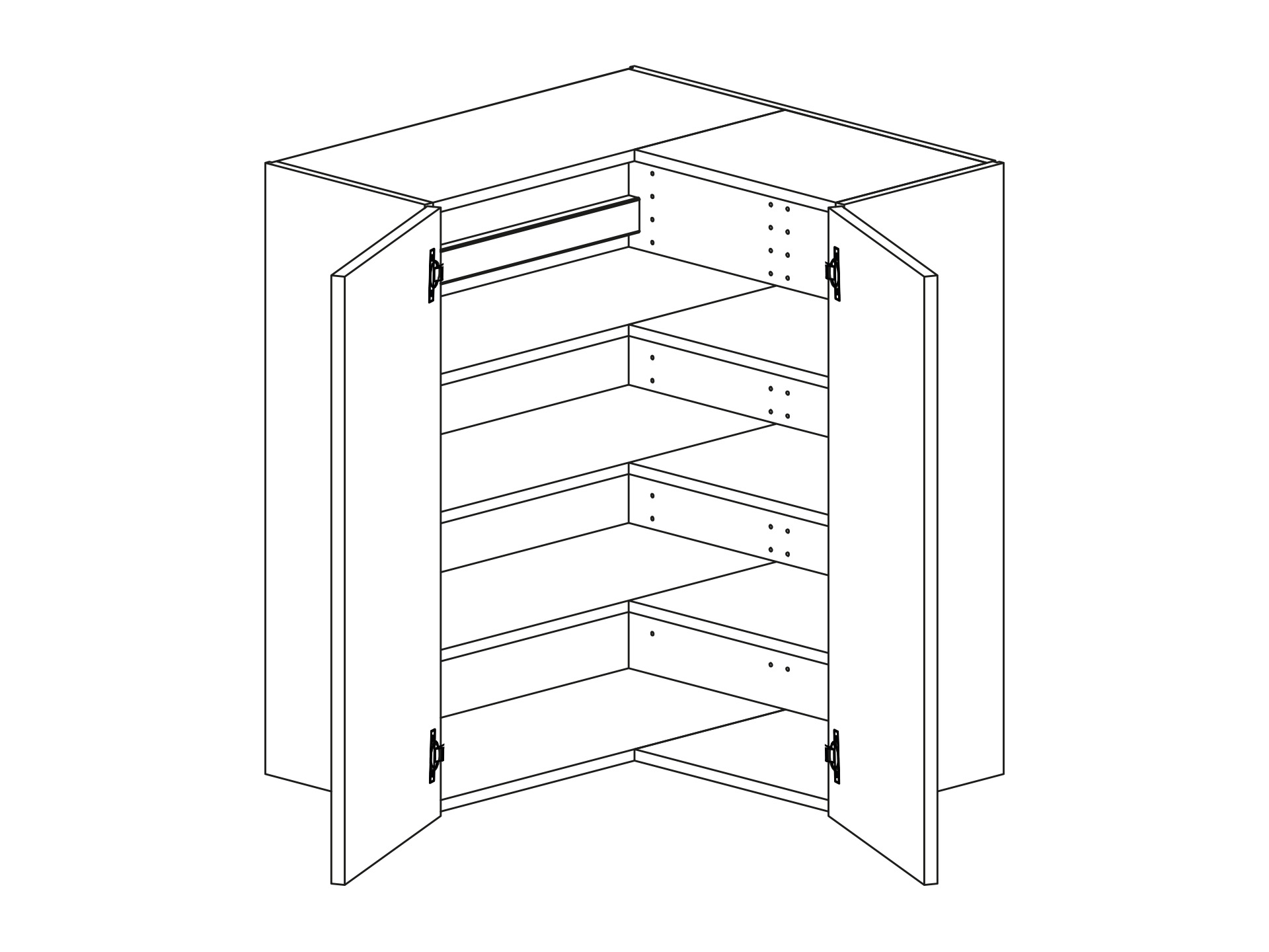 Väggskåp hörn i vinkel 700x700 med parlucka, endast handtag på en av luckorna och handtag kan inte monteras från Vedum fabrik. Kunden väljer själv på vilken av parluckorna handtaget ska placeras. Kan inte fås med vitrinluckor. Kan inte väljas med Vera och Liv grepplist då det blir ett hål där grepplisterna möter varandra. Kan inte fås med push-öppning.