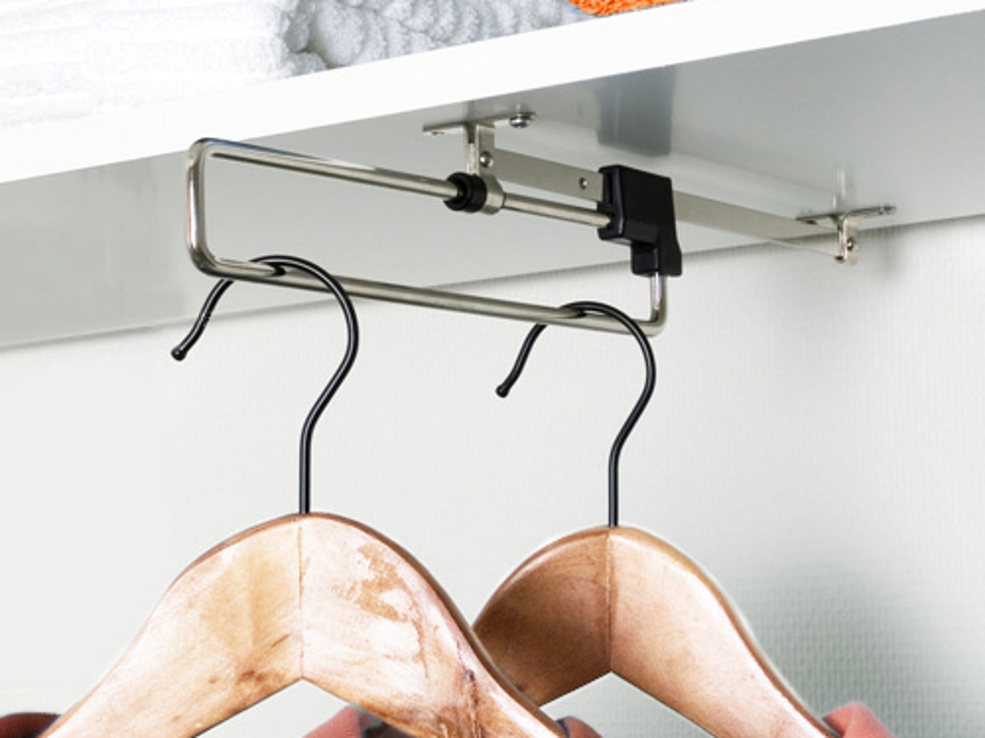 Utdragbar klädstång, för montering i djupled under ett hyllplan eller garderob. Finns i två längder. Ingår som standard i garderober djup 430 mm.