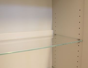 Glashylla i djup 275 mm för väggskåp vitrin djup 302 mm för placering framför spikregel i skåpet.