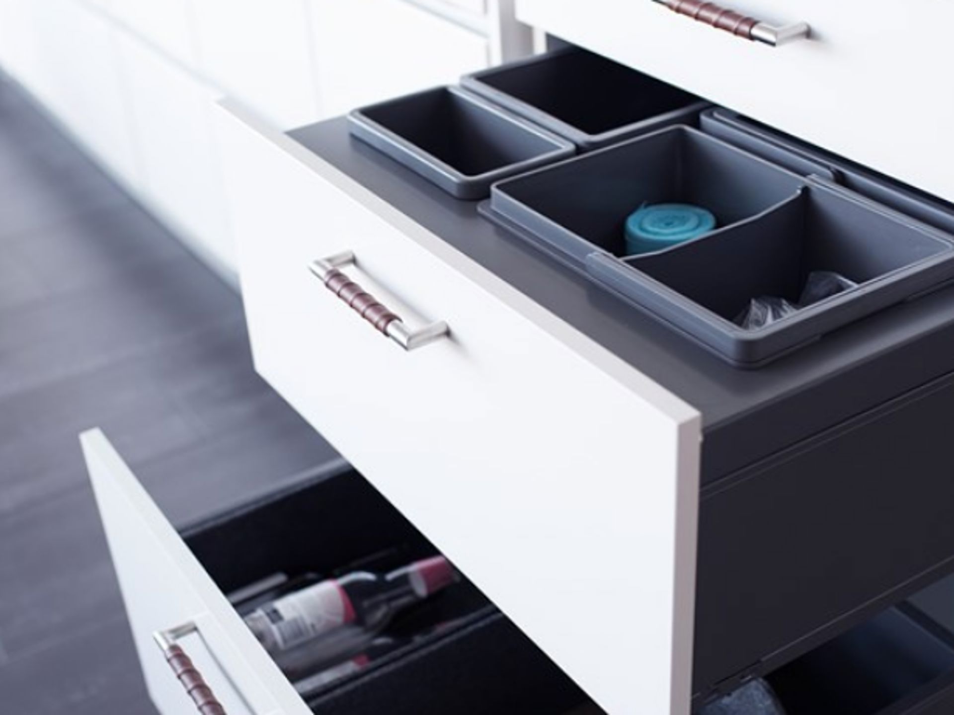 System för källsortering i bänkskåp med One/Classic fullutdragslådor fronthöjd 282 mm, låddjup 500 mm. Finns till skåp i bredder 400, 600 och 800 mm. Paket med ram i antracitgrå plåt och hinkar i antracitgrå återvunnen polypropen (PP)-plast. Som tillbehör finns loch och avdelare till hinkarna.