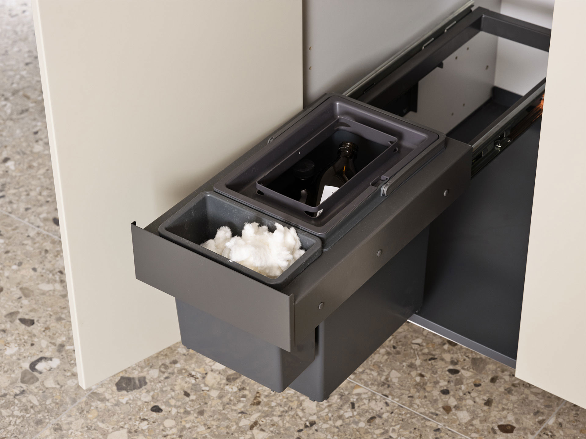 Sarek system för källsortering smal till diskbänkskåp med lucka, skåpsbredd minst 300 mm. Sidohängd utdragbar ram i antracitgrå plåt.
