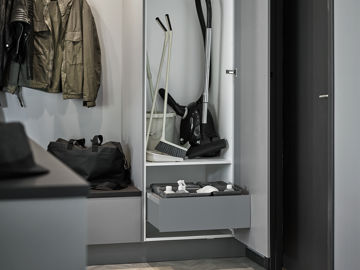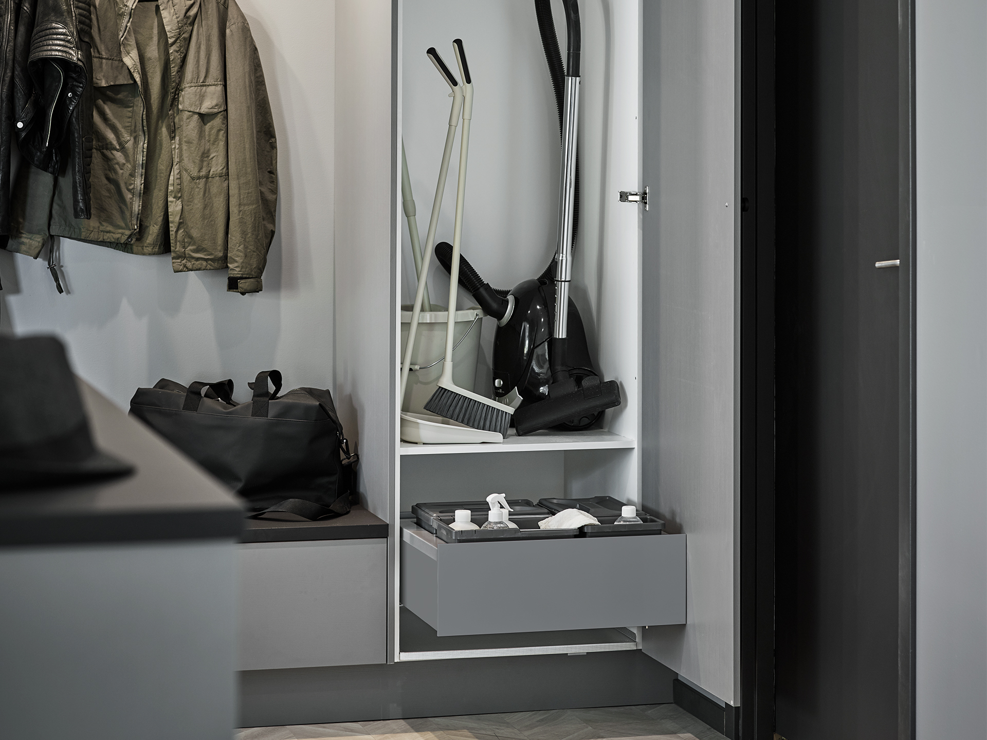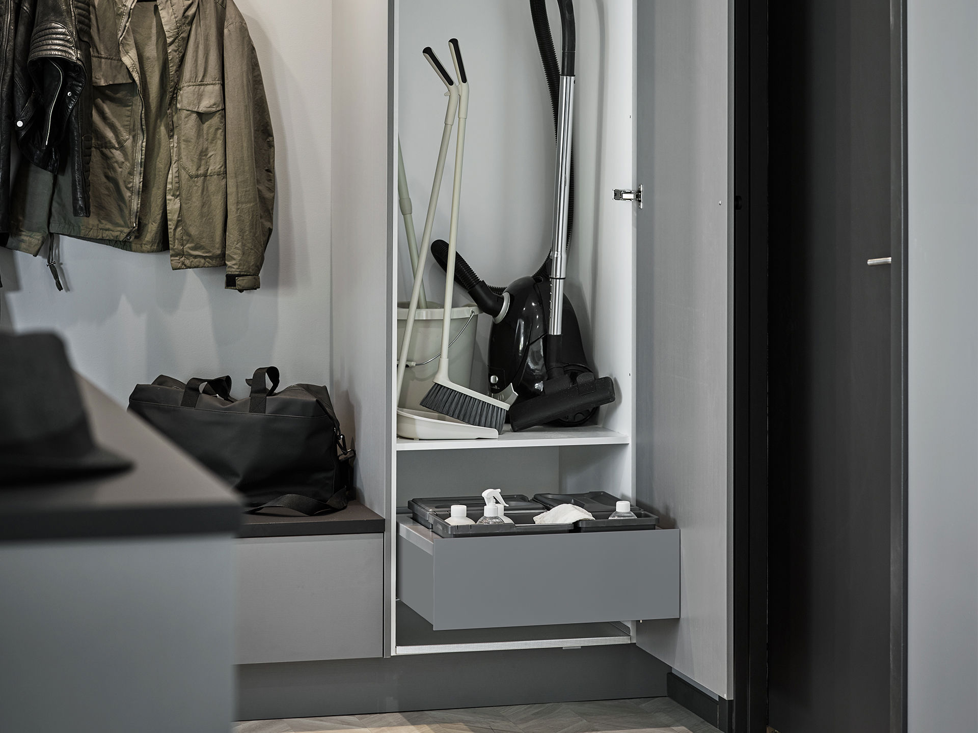 System för källsortering i invändiga höga lådor (fronthöjd 282 mm) One/Classic djup 500 mm och Scala djup 550 mm, finns för flera skåpsbreder. Paket med ram i antracitgrå plåt och hinkar i antracitgrå återvunnen polypropen (PP)-plast med lock och en avdelare. Extra avdelare till 8 liter hinken finns som tillbehör art.nr 30865 samt extra lock art.nr 30866.