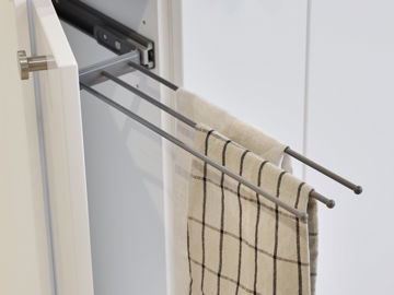 Handdukshängare med tre utdragbara stänger och skena inklusive två systemskruv för montering. Minsta skåpsbredd=200 mm. Belastningskapacitet 3 kg. Ingår som standard i handduksskåp.