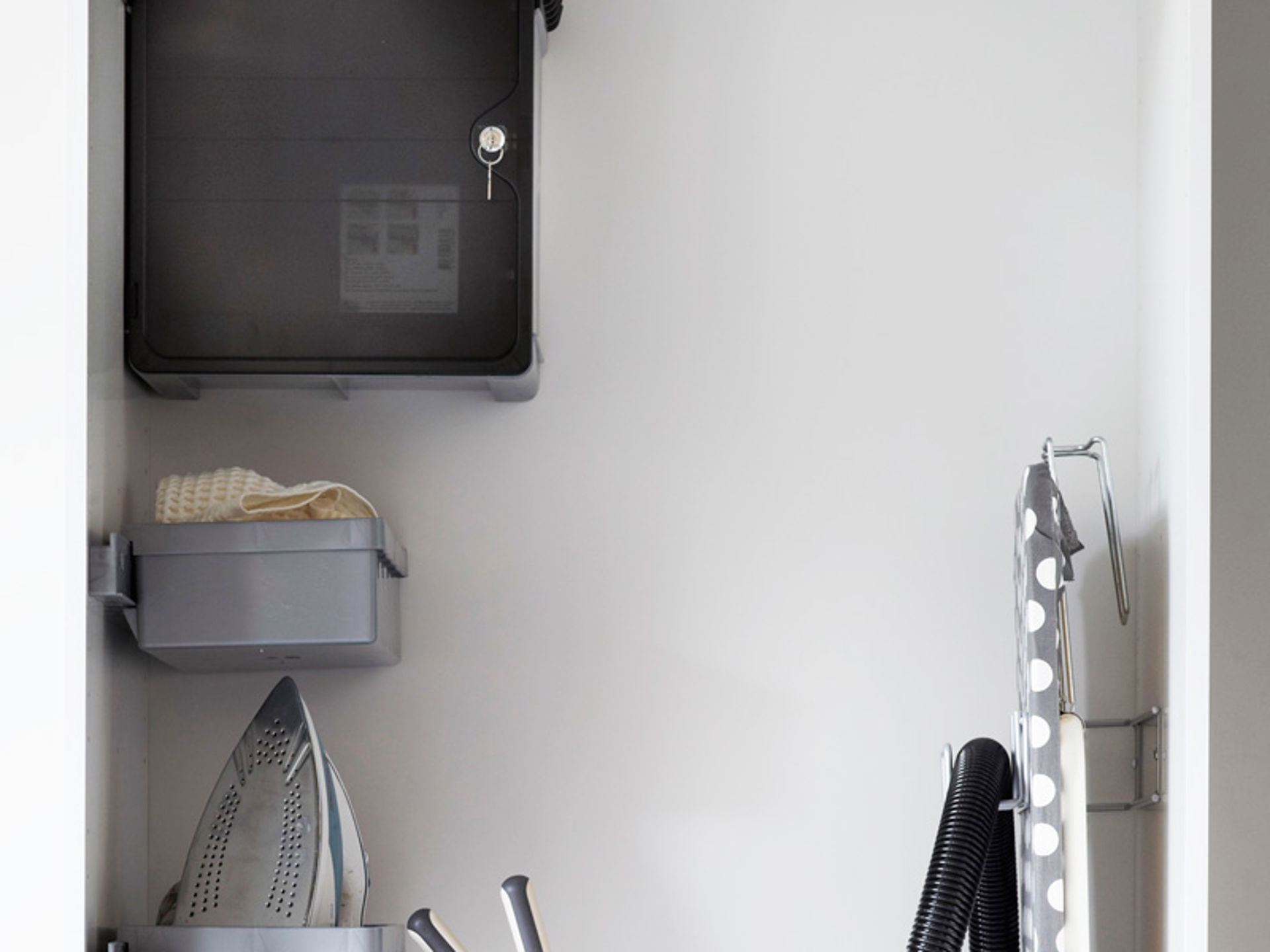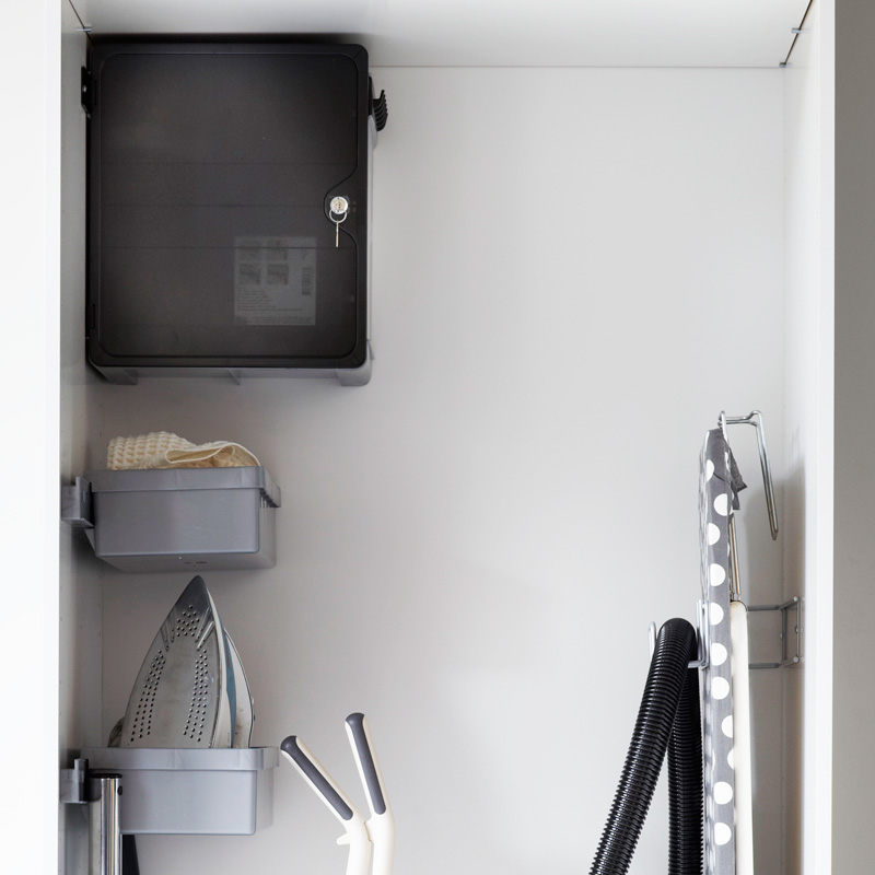 Ingår som standard i städskåp 2500840-80, 2500940-80, 2600840-80. Innehåller två backar, medicinskåp i grå plast och strykbrädeshållare med dammsugarslanghållare.