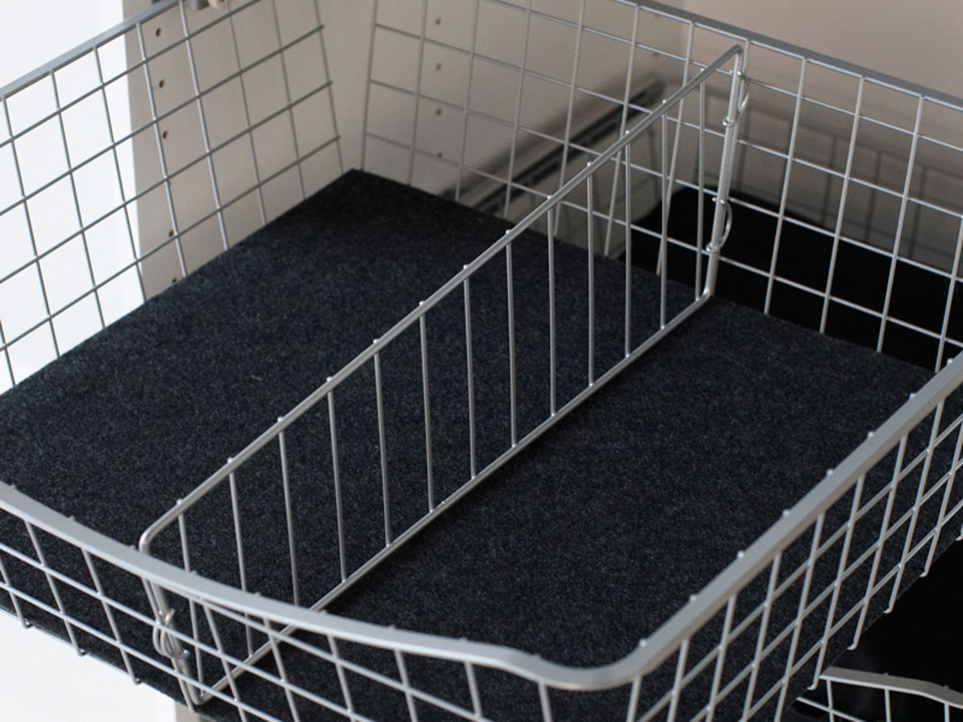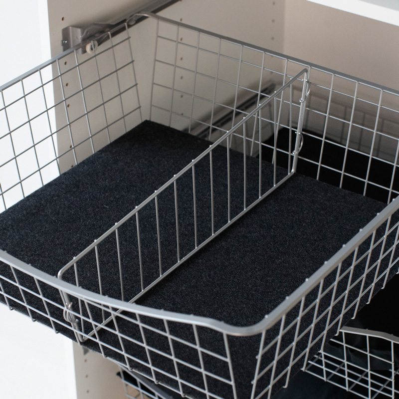 Avdelare som passar till trådbackar. Kläms fast i trådbackens i framkant, underkant och bakkant. Inga verktyg behövs. Finns till låga trådbackar i höjd 150 och till höga i höjd 330 mm. OBS ny färg antracitgrå fr.o.m februari 2026.