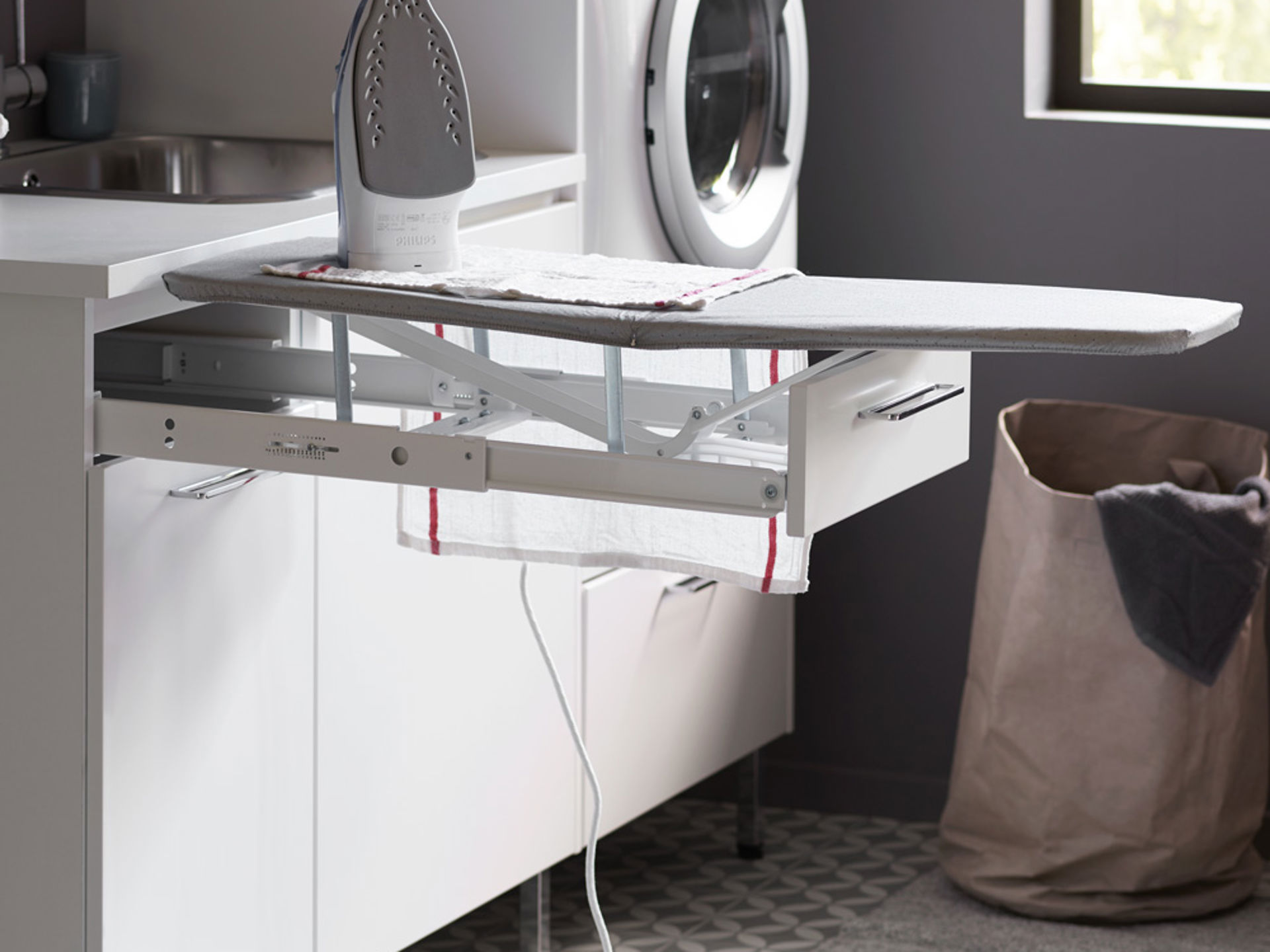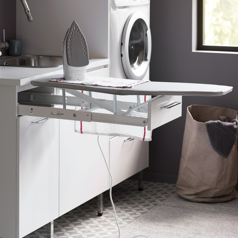Hopfällbar strykbräda för skåpsbredd 400 mm bakom lådfront med måttet 125 x 396 mm. Ingår som standard i Bänkskåp med strykbräda art.nr 100740.