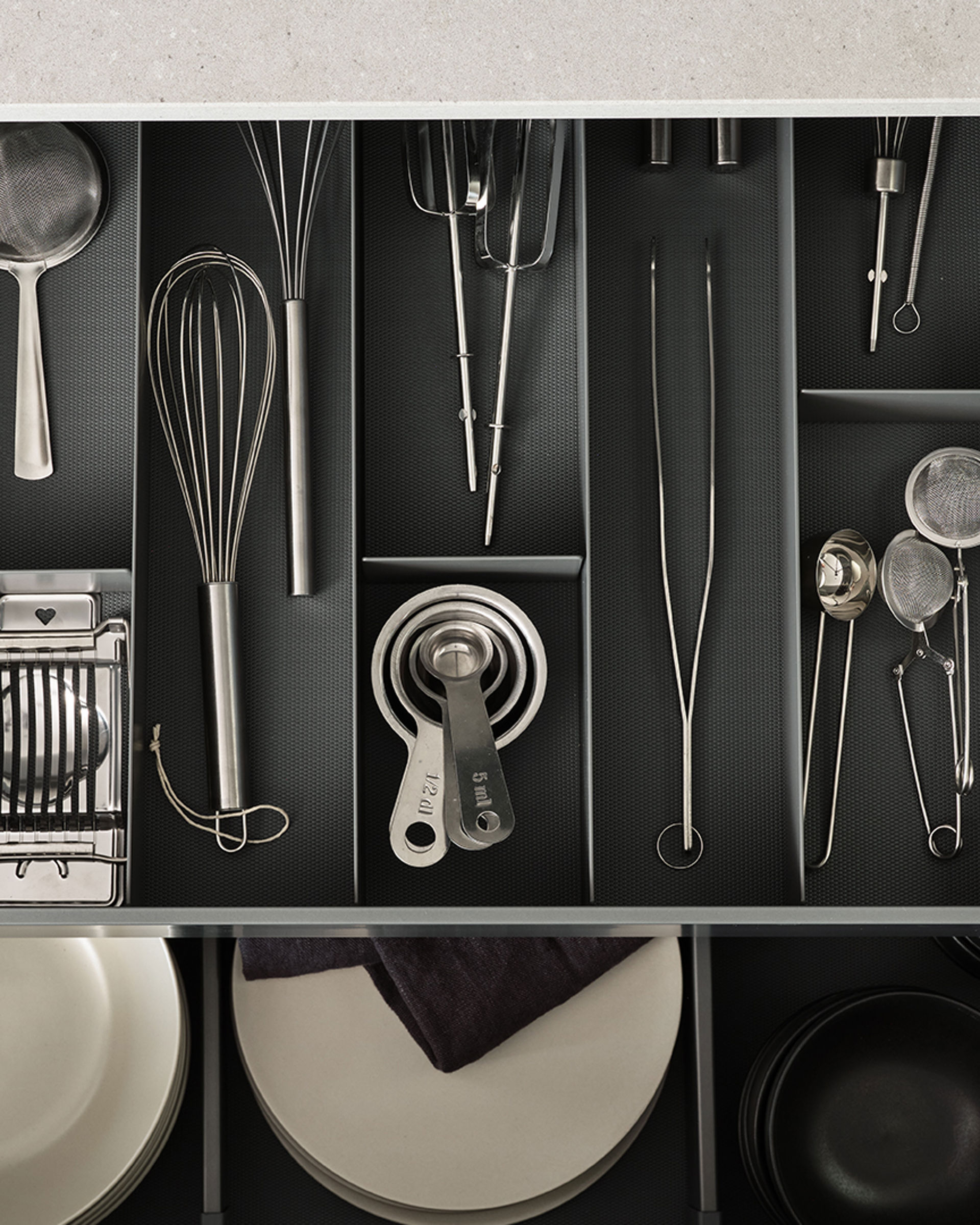 Våra två lådsystem Scala och nya One tar design och funktion till nya nivåer. Båda kommer i sobert antracitgrått med utvald inredning som kan anpassas som du vill, pushfunktion som alternativ och mjuk, ljudlös stängning. Scala har extra djupa lådor och höga sidor utan reling, medan One erbjuder fullutdrag i standardjup och sidor med en stilren fyrkantig reling.