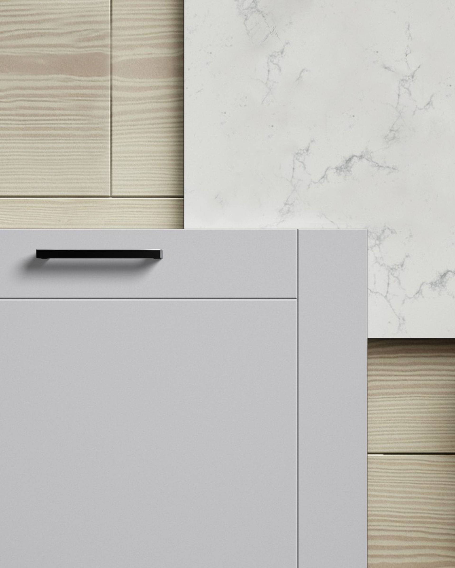 Målad lucka av 16 mm MDF-board med frästa spår och svagt rundad kant. Levereras i alla kulörer mot kulörtillägg med några få undantag. Finns också i vitrin med klarglas.