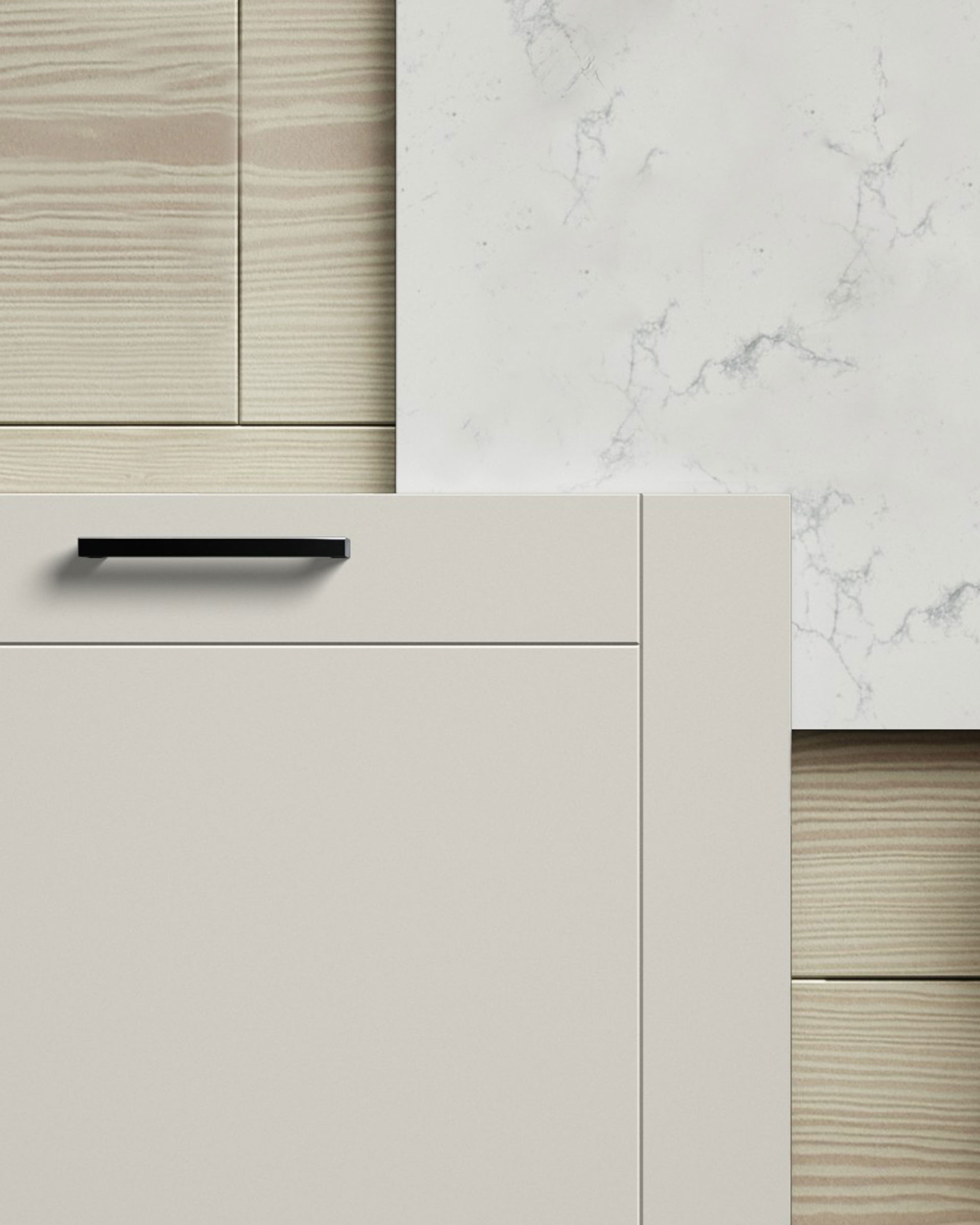 Målad lucka av 16 mm MDF-board med frästa spår och svagt rundad kant. Levereras i alla kulörer mot kulörtillägg med några få undantag. Finns också i vitrin med klarglas.