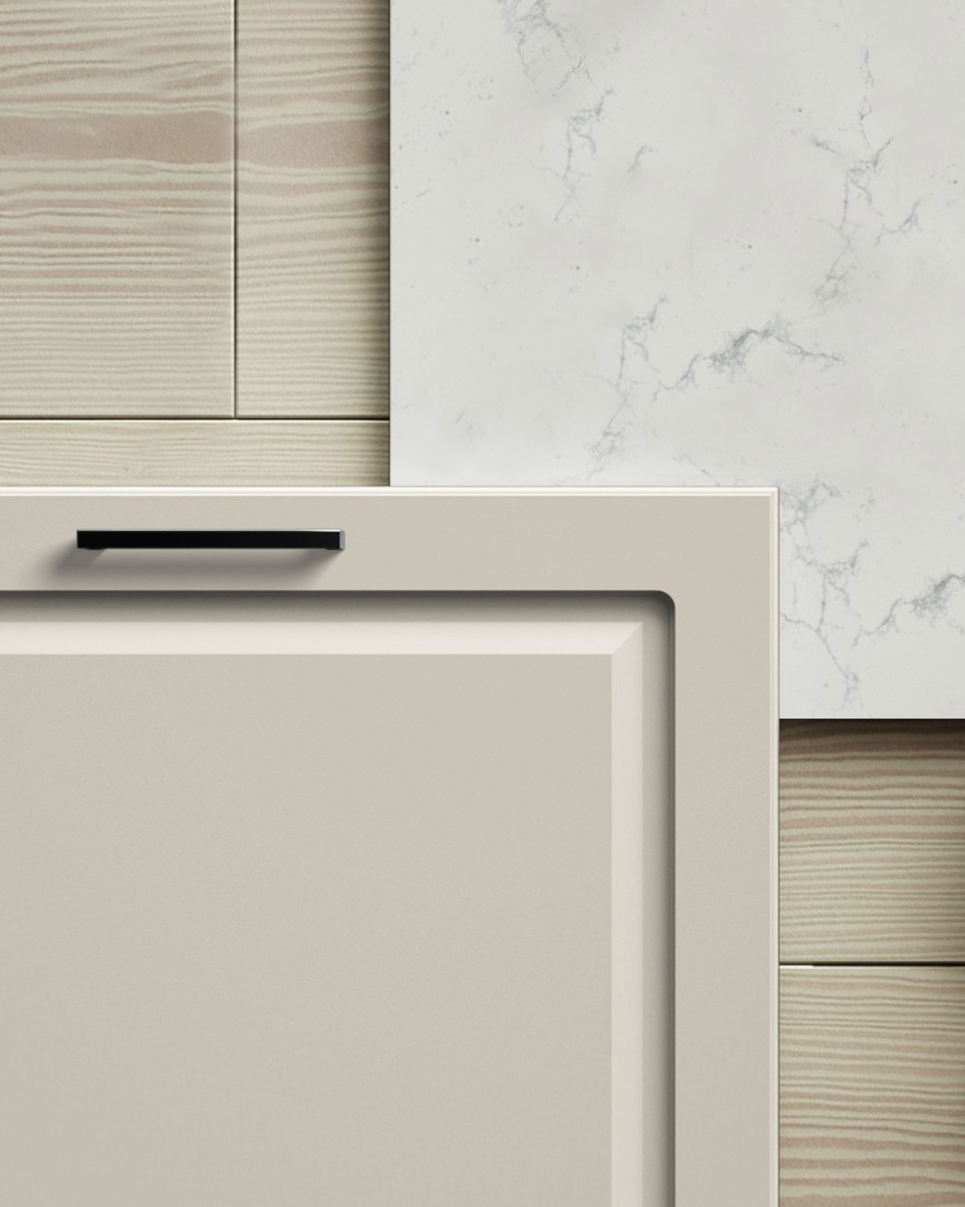 Målad lucka av 19 mm MDF-board med fräst profil och svagt rundad kant. Levereras i alla kulörer mot kulörtillägg med några få undantag. Finns också i spröjsad vitrin med klarglas. Toppvitrin finns till skåp i höjd 988 och 1138 mm i tre bredder med klarglas.