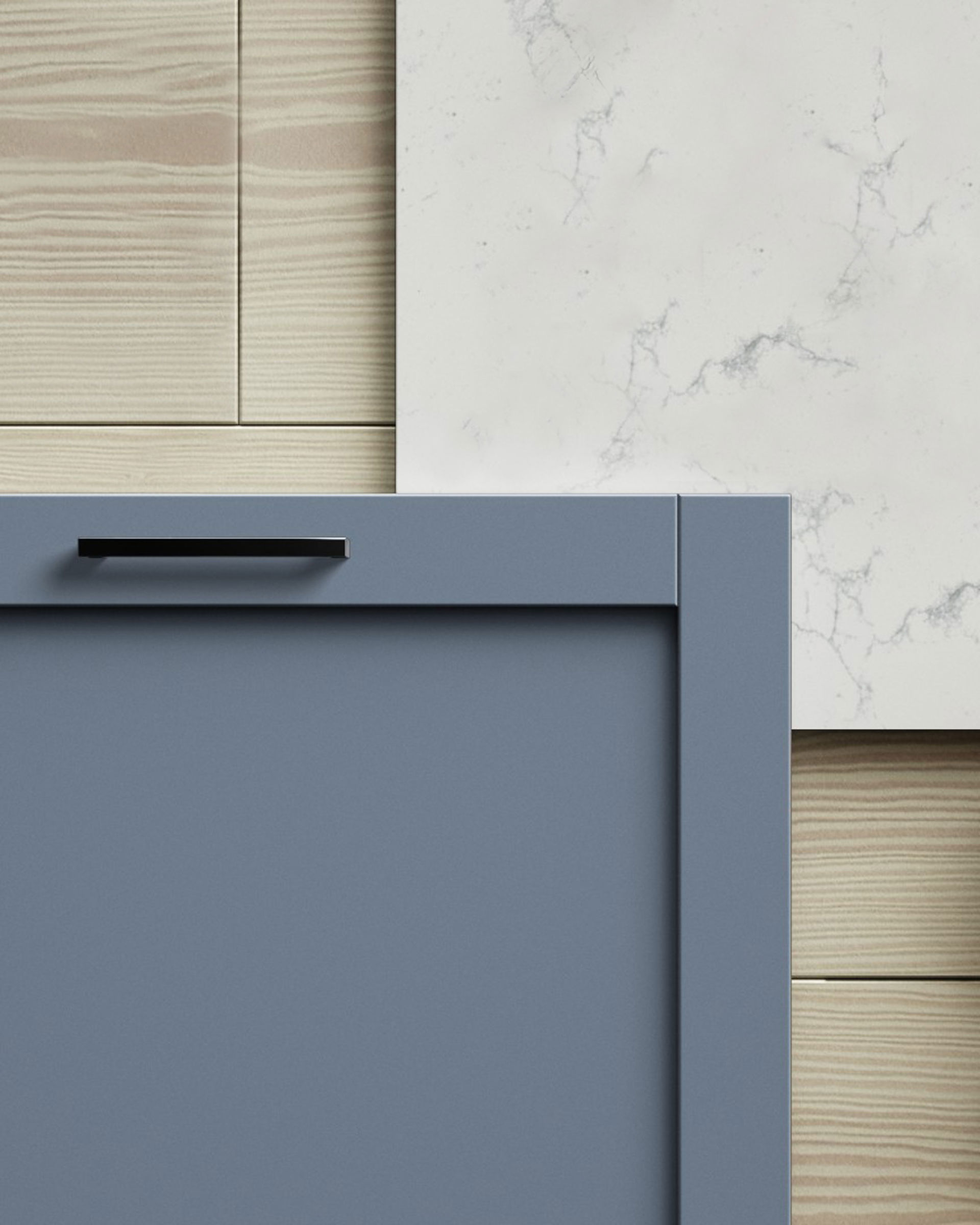 Målad lucka av 19 mm MDF-board med ram och slät spegel, svagt rundad kant. Levereras i alla kulörer mot kulörtillägg med några få undantag. Finns också i vitrinlucka med klarglas, med eller utan spröjs.