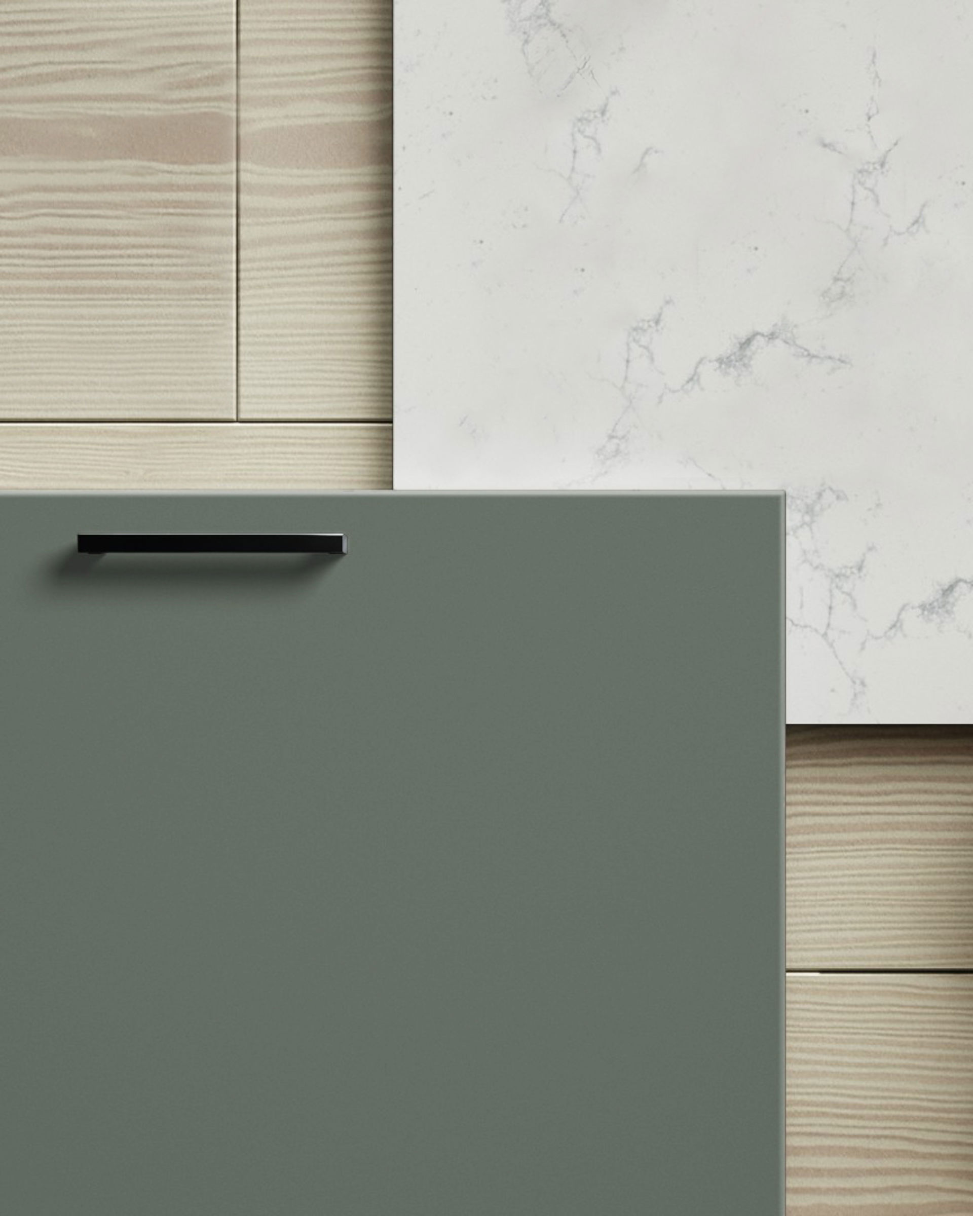 Luckan Maja är en slät lucka som skapar ett lugn och en harmonisk bas för köket. Den svagt rundade kanten ger ett mjukt intryck som balanserar det stilrena – en liten detalj som gör stor skillnad.