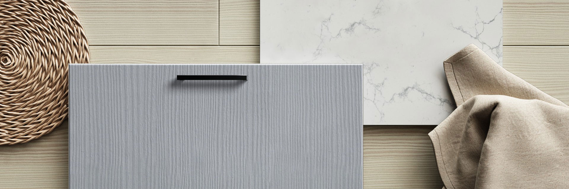 Grå melaminbelagd lucka av 16 mm fukttrög MDF-board med trästruktur, svagt rundad kant. Kantlist i ABS. Liggande trämönster på lådfronter och stående på