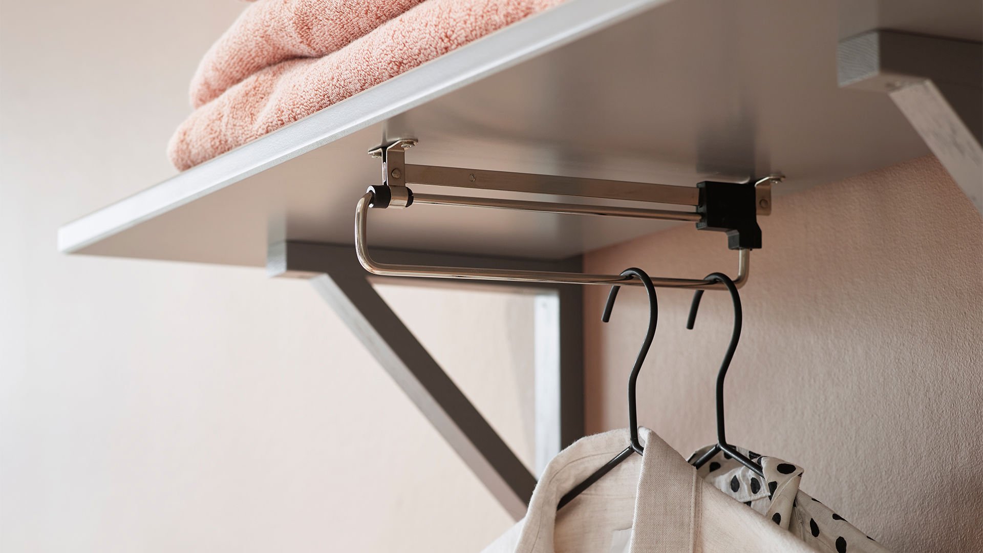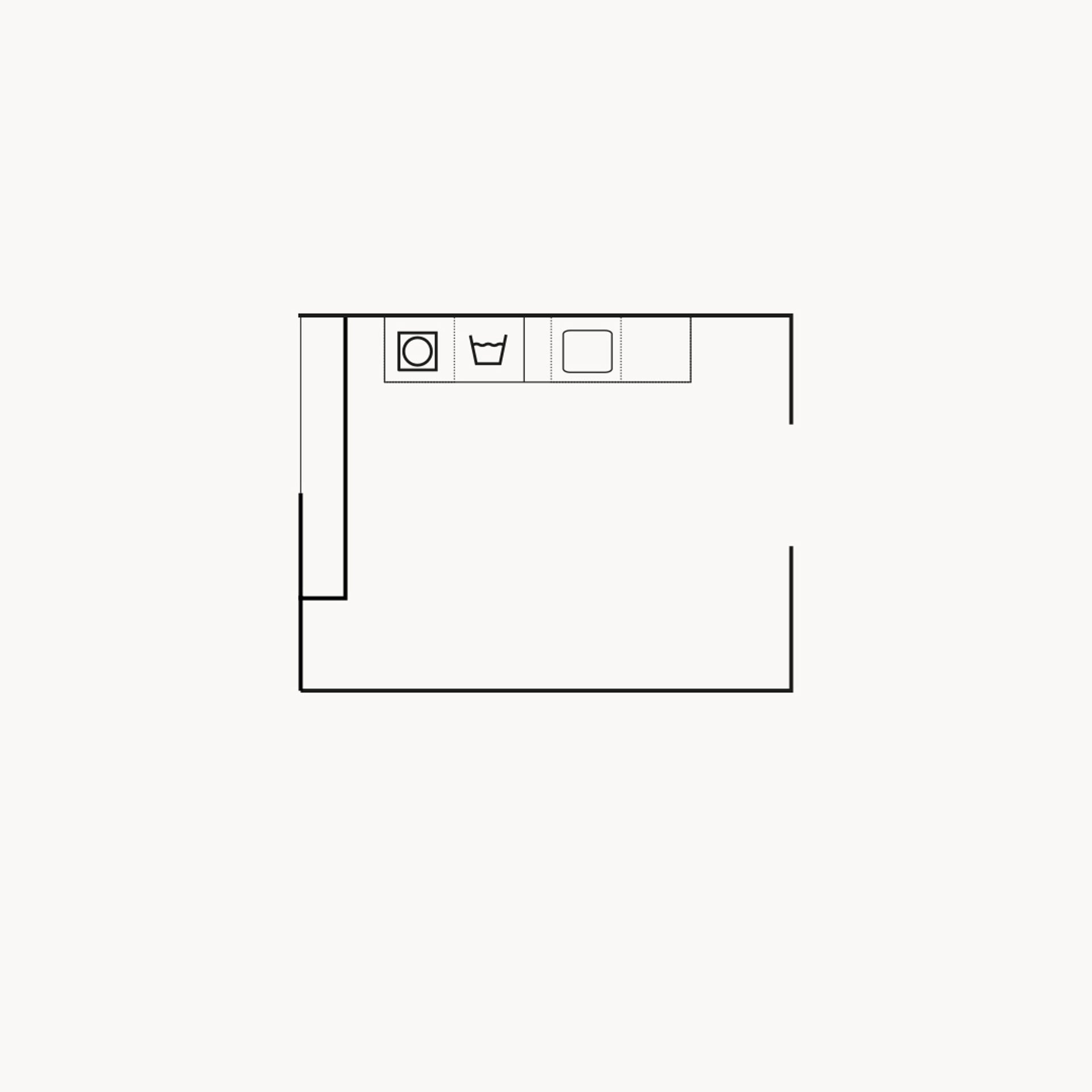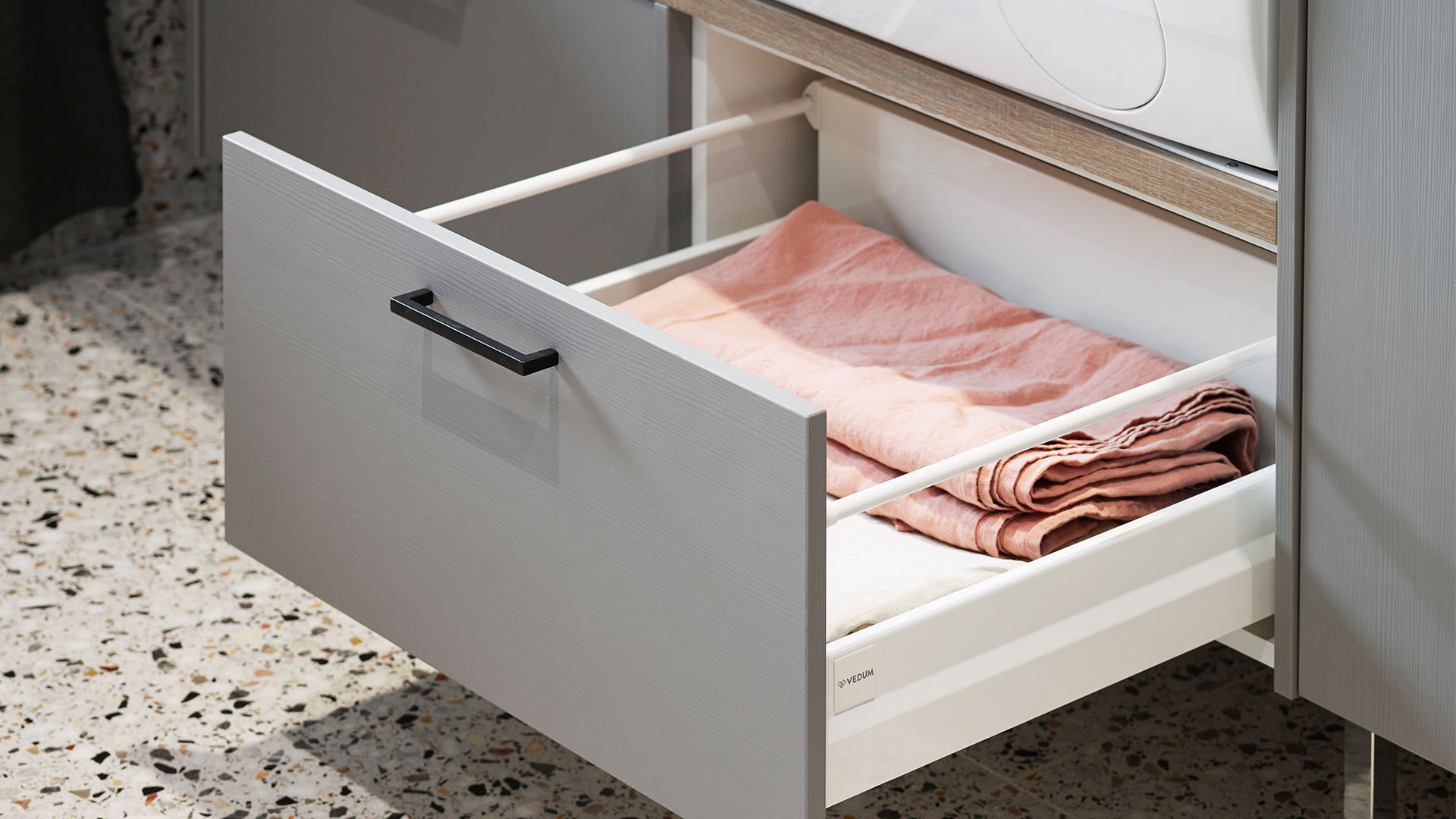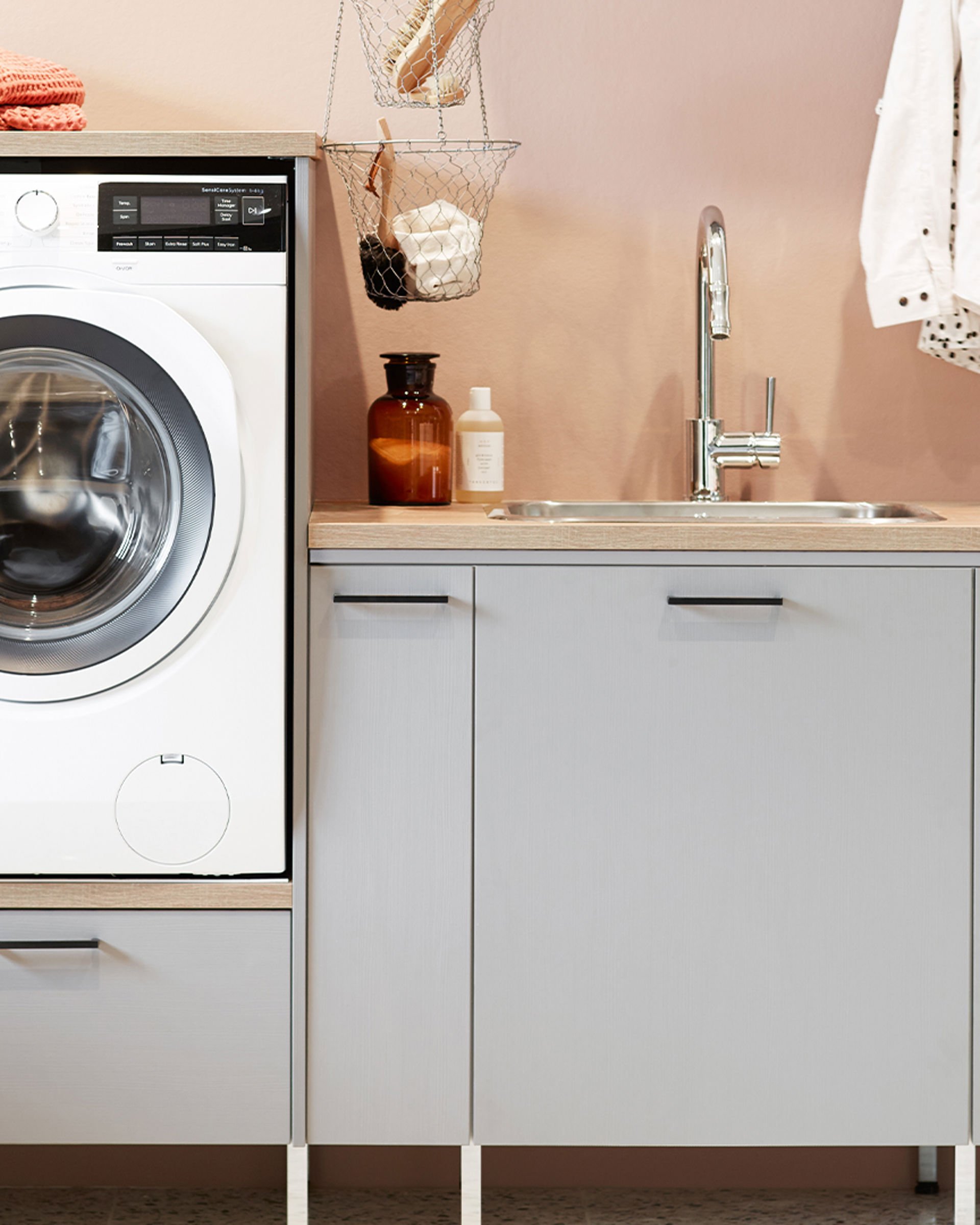 En hållbar tvättstuga med Svanenmärkta luckan Nora och vitvaror i arbetsvänlig höjd. Avställningsyta ovanpå vitvarorna, smalt utdragsskåp med plats för flaskor och småförpackningar, och klädstång under hyllan för att hänga våta eller nystrukna kläder. Svala färger, stilrena linjer och ett härligt terrazzogolv skapar en välkomnande miljö.