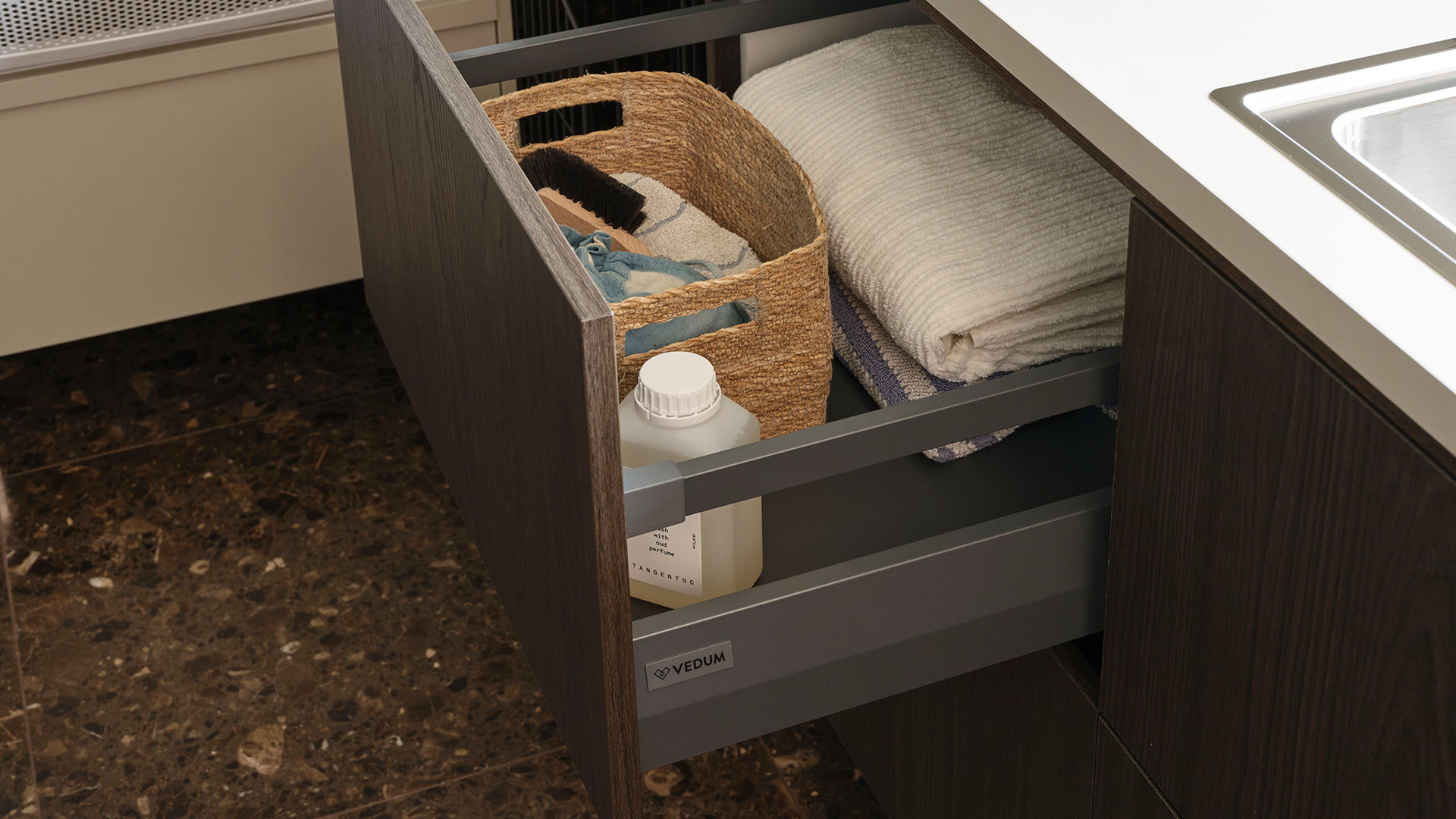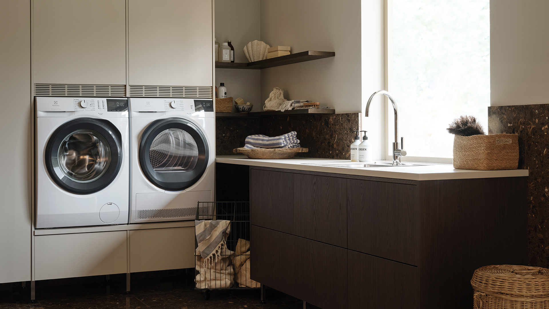 Den nya Svanenmärkta melaminluckan Ilse beige och Ilse brun ek gör tvättstugan till en lugn oas. Garderobsvägg, upphöjda vitvaror och bra arbetsytor på bänkskiva gör vardagen enklare. Hyllplan med plats för småsaker och lättillgängliga tvättkorgar i det öppna hörnet förstärker känslan av bekvämlighet. Ett fint terrazzogolv och stänkpanel knyter ihop helheten.