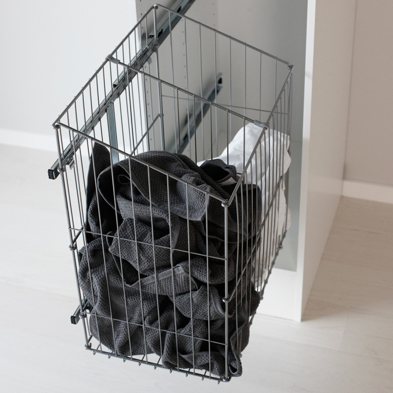 Sidohängd utdragbar tvättkorg för skåp. Kan även placeras fristående på hjul.